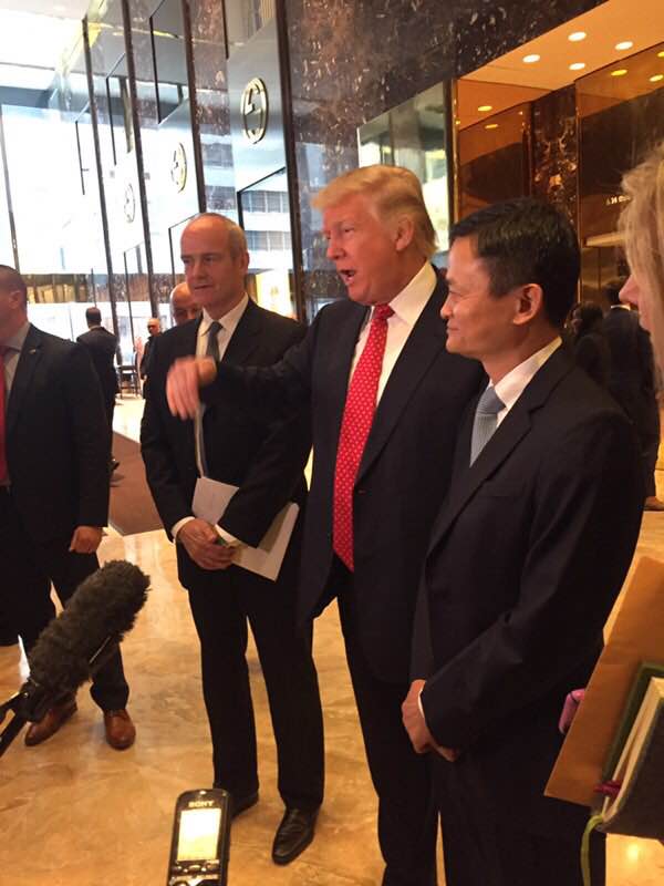 2017年1月10日凌晨,马云在纽约与美国当选总统特朗普会面,不在场的小企业和消费者成了这场会谈的主角。马云向特朗普描绘了两国加强企业间合作的美好前景:“现在中国正在从制造大国转向消费大国,这对美国中小企业和消费者来说,也是一个巨大的机会。”会后,特朗普愉快地对媒体表示:“将与马云携手做一些伟大的事情,关于中小企业”。