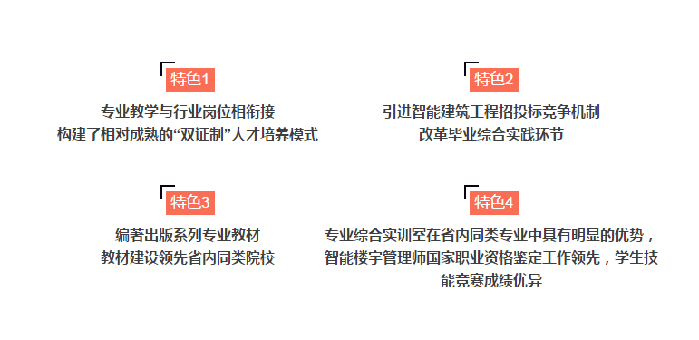 省内最早的楼宇智能化专业之一,自2002年开设至今,已有12年办学历史。专业教学以智能建筑工程设计和施工类岗位技能为核心,培养的毕业生遍布宁波市及周边地区建筑智能化双甲资质及其他资质企业的技术骨干岗位。行业单位认为我们的学生“比本科生、研究生还好用”。