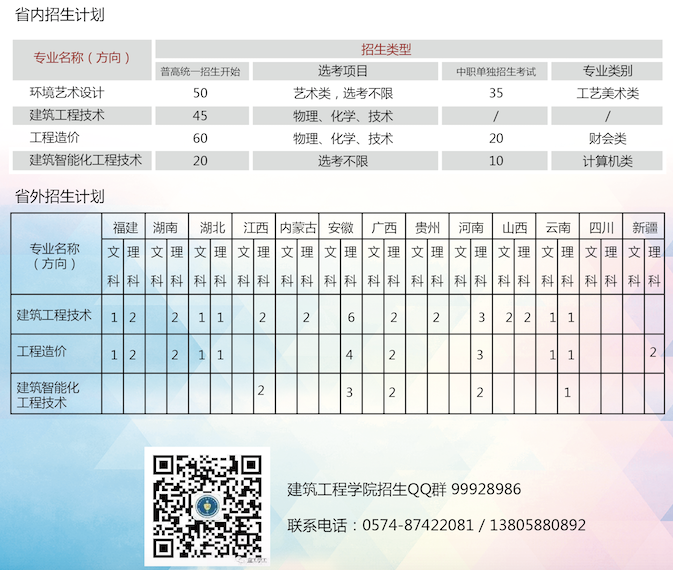 又是一年一度的招生季,经历完紧张高考的你,定在思考着前往哪个高校。与其说高考定终身,不如说专业看一生。社会分工日益精细,专业化的技能型人才供不应求。浙江工商职业技术学院建筑工程学院位于浙江宁波中心城区,是浙江省最早的一批专业建筑工程学院,更是学校的王牌特色学院,共有4个专业,分别是工程造价专业(宁波市重点专业)、建筑智能化工程技术专业、建筑工程技术专业、环境艺术设计专业。