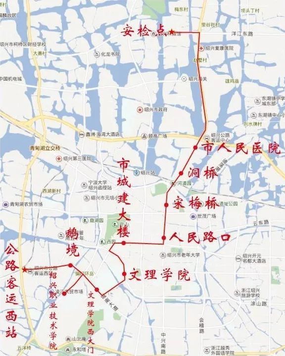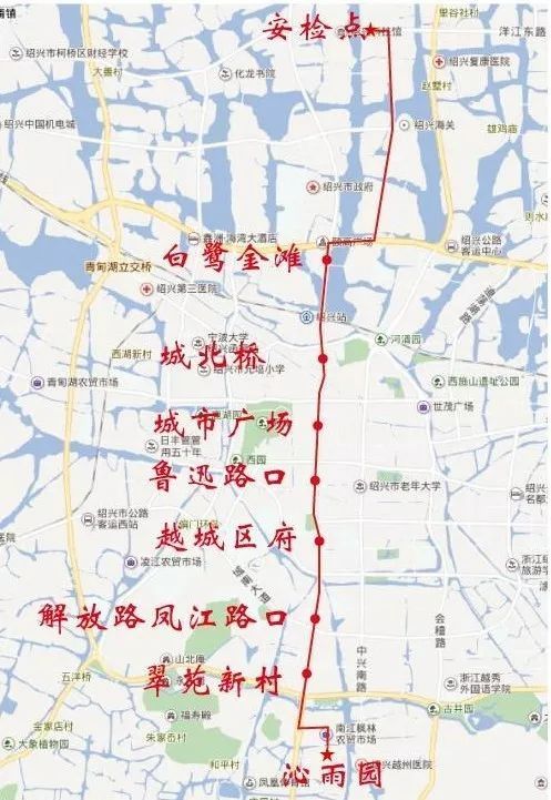 停靠站点:公路客运西站、鹅境、绍兴职业技术学院(浙江邮电职业技术学院)、文理学院西大门、文理学院(新廊桥花园酒店)、市城建大楼(银泰大酒店)、人民路口、宋梅桥(薇阁精品酒店)、洞桥(莫泰酒店)、市人民医院(中金豪生酒店、维也纳酒店、中成柏悦酒店)。