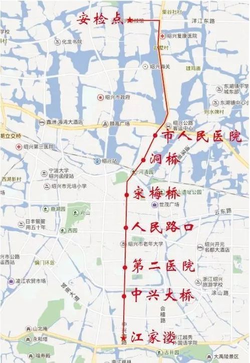 停靠站点:江家溇(花开富贵大酒店)、中兴大桥、第二医院(梦江南假日酒店)、人民路口(新亚都大酒店、格林豪泰酒店)、宋梅桥、洞桥(莫泰酒店)、市人民医院(中金豪生酒店、维也纳酒店、中成柏悦酒店)。