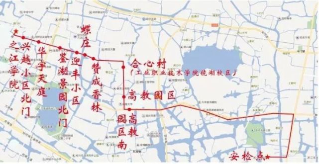 停靠站点:之江学院、兴越小区北门、华宇天庭、鉴湖景园北门、迎丰小区、蝶庄、赞成香林、合心村(工业职业技术学院镜湖校区)、高教园区、高教园区南。