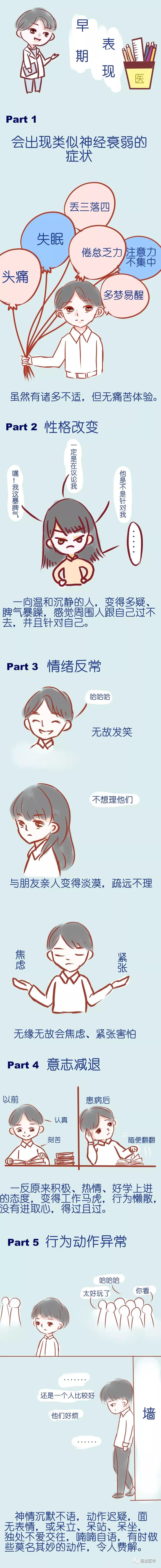 患者一般意识清楚,智力基本正常,部分患者在疾病过程中会出现认知功能的损害。病程一般会发生疾病反复发作、有时还会有病情加重甚至恶化的情况,部分患者还会出现衰退和精神残疾,庆幸的是有部分患者经过治疗后可保持痊愈或基本痊愈状态。