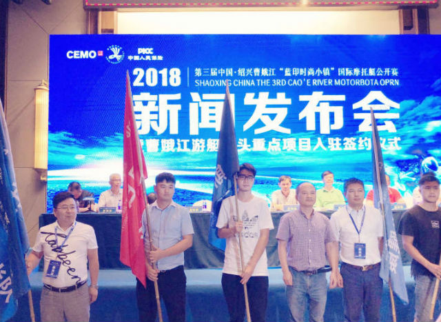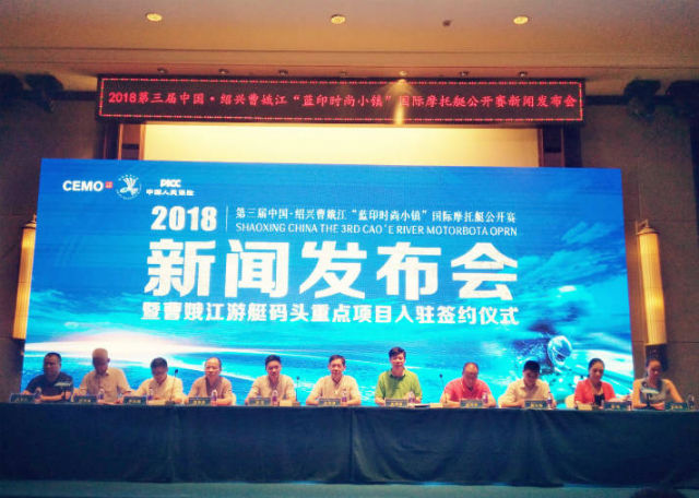 2018第三届中国绍兴曹娥江“蓝印时尚小镇”国际摩托艇公开赛新闻发布会暨曹娥江游艇码头重点项目入驻签约仪式于7月26日下午在绍兴曹娥江游艇度假酒店曹娥厅盛大召开,来自全国几十家各大主流媒体、30多家企业代表及志愿者,共同见证赛事发布会的隆重举行。