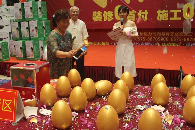 现场砸金蛋、抽奖活动的开始,让周年庆典进入了热潮,礼炮齐齐放响,金花四溅,寓意我们的活动也如礼花绽放那般精彩纷呈!每个客户都开始活跃起来与活动主持人进行互动赢取奖品,参与砸金蛋的第一位客户幸运的拿下了特等奖8888元现金,点燃了在场所有人的激情,多位客户纷纷上台积极参与进来。