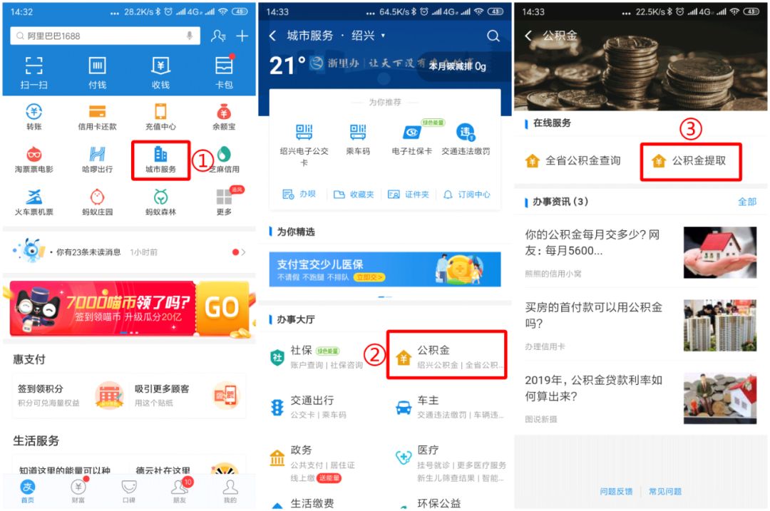 ③还可以选择“支付宝”的,在“城市服务”模块中,找到“公积金”办理公积金提取业务。