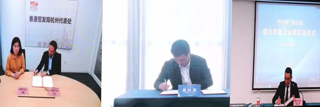 启动仪式上,绍兴市商务局分别与香港贸发局和联亚国际展览集团进行了线上战略合作签约。
