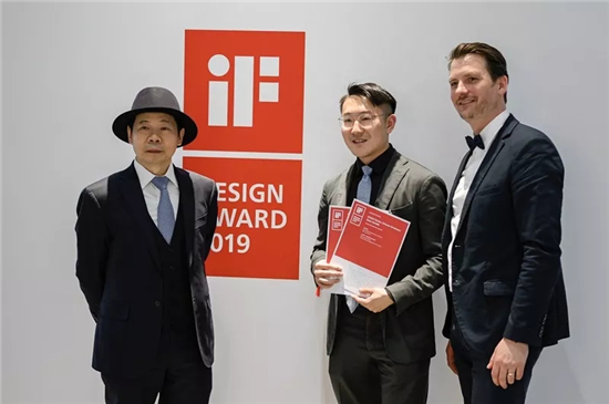 3月11日下午14时,ISH为荣获“Design Plus”奖项的品牌进行现场颁奖,蓝色卫浴总经理危五祥、副总经理危一夫及其德国设计中心设计师上台领取了该奖项。