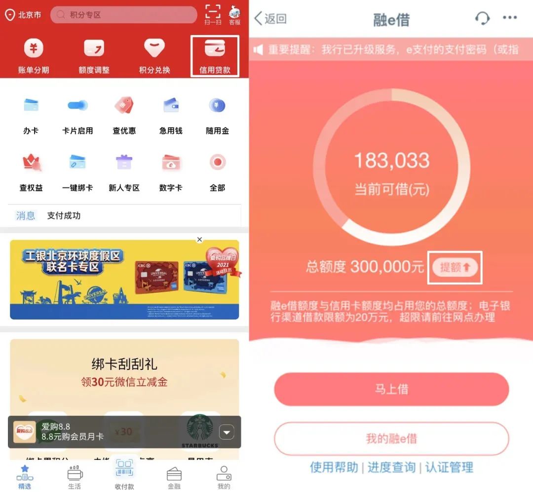 登陆“工银e生活”,选择“信用贷款” ☛ “提额”。