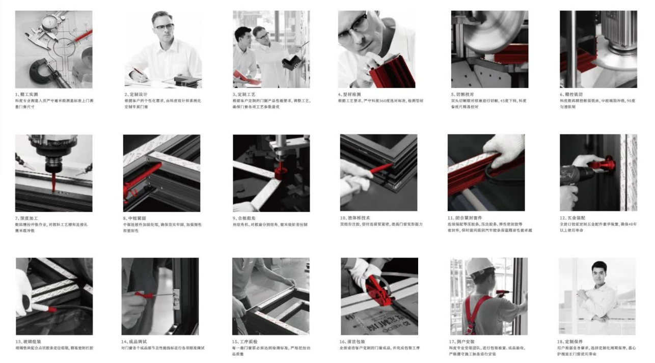 精工实测、定制设计、定制工艺、型材检测、框扇切割、中挺断面冲铣、孔槽冲铣、中挺禁锢、合框组角、注胶延时检测、密封件装配、五金装配、玻璃组装、成品调试、工序质检、清洁包装、到户安装、定制保养。