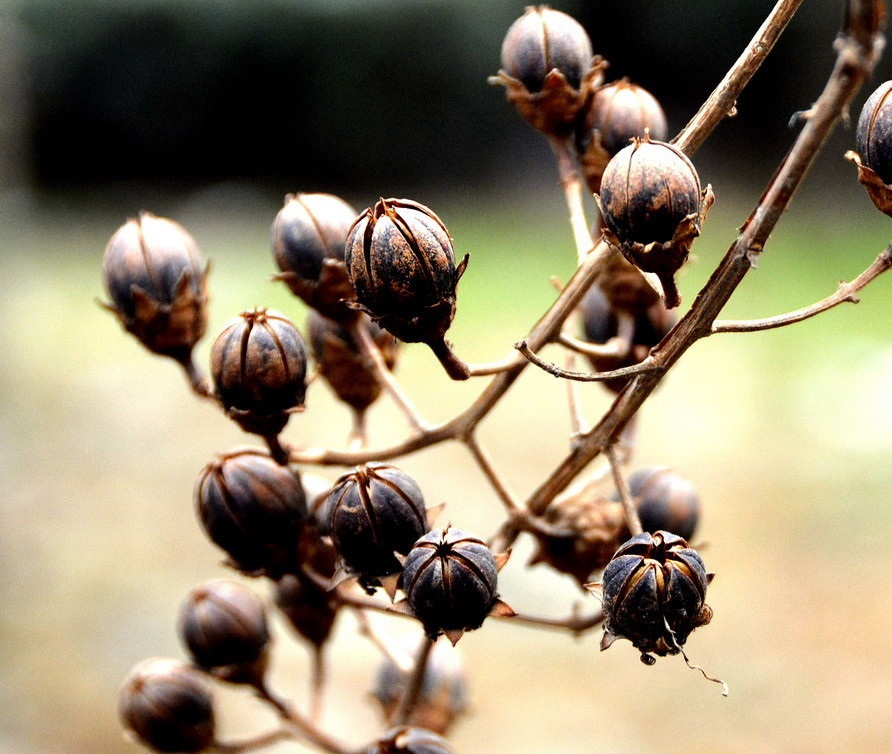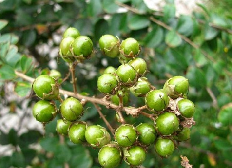 花淡红色或紫色、白色,直径3-4厘米,常组成7-20厘米的顶生圆锥花序;花梗长3-15毫米,中轴及花梗均被柔毛;花萼长7-10毫米,外面平滑无棱,但鲜时萼筒有微突起短棱,两面无毛,裂片6,三角形,直立,无附属体;花瓣6,皱缩,长12-20毫米,具长爪;雄蕊36-42,外面6枚着生于花萼上,比其余的长得多;子房3-6室,无毛。蒴果椭圆状球形或阔椭圆形,长1-1.3厘米,幼时绿色至黄色,成熟时或干燥时呈紫黑色,室背开裂;种子有翅,长约8毫米。花期6-9月,果期9-12月。