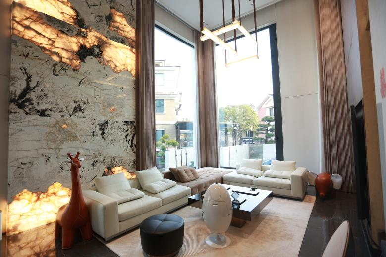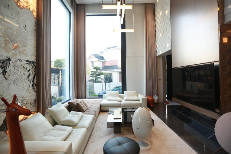 双层挑高客厅是别墅最大看点。两侧墙面各一面宽达3米、高5.1米的超大微通风窗。