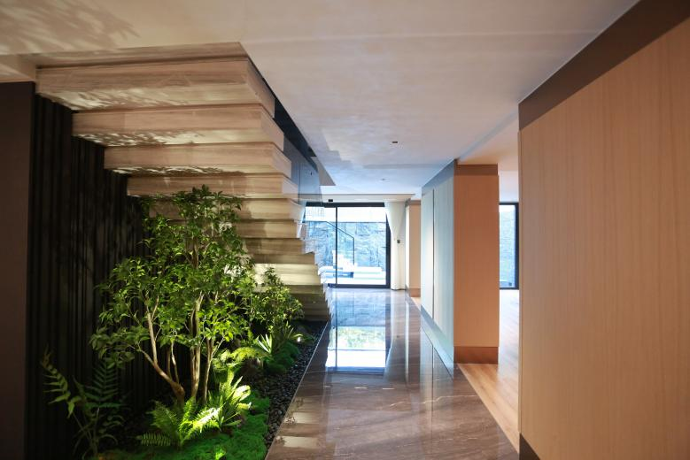 沿客厅楼梯层层而下,穿过一段苔藓蕨草、矮植丛生的秘境,光影斑驳,清幽静谧,好似心入空谷。