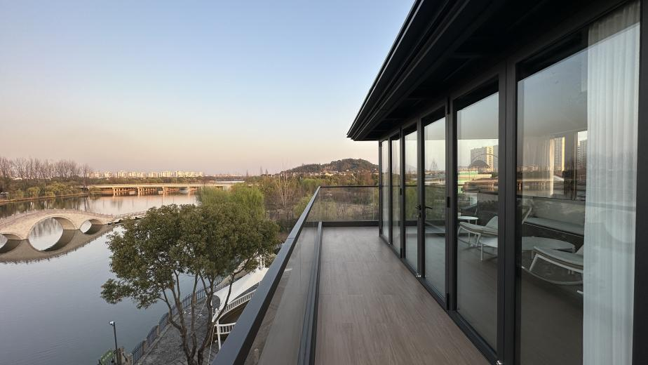顶楼阳光房,更令人神往。面朝山水一侧,可折叠的推拉门,向自然完全敞开。