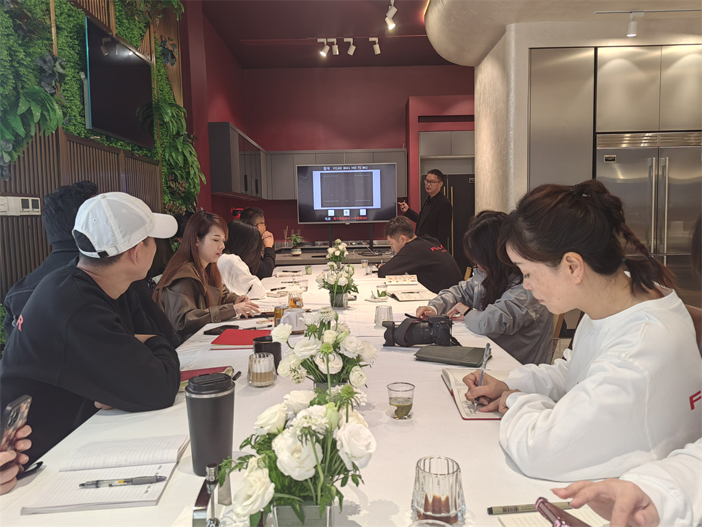 20余名全国部分区域合作伙伴共聚一堂,认真学习福戈米兰产品体验式销售全流程、产品应用、日常维护保养、空间规划、落地安装等知识内容,并实景演练晚宴接待全流程。