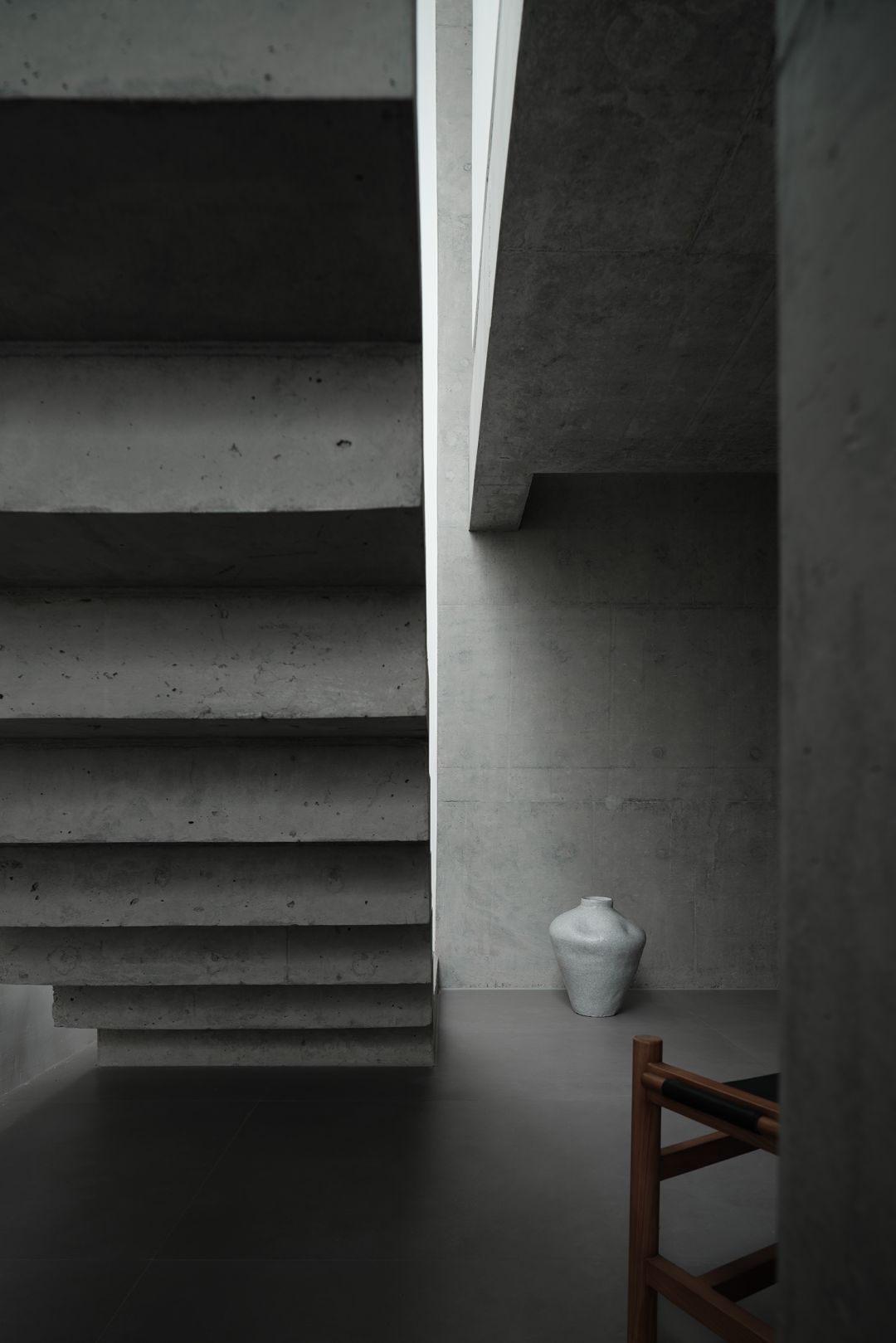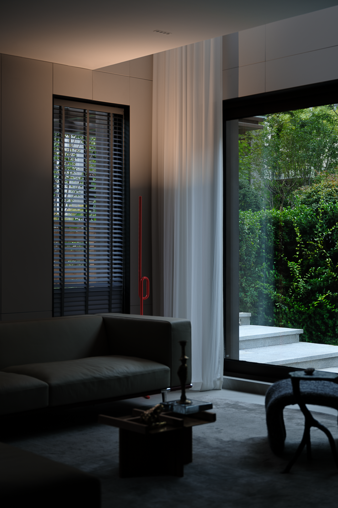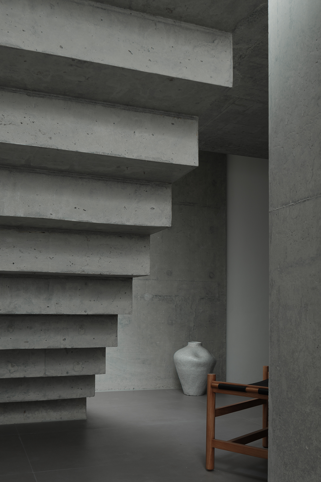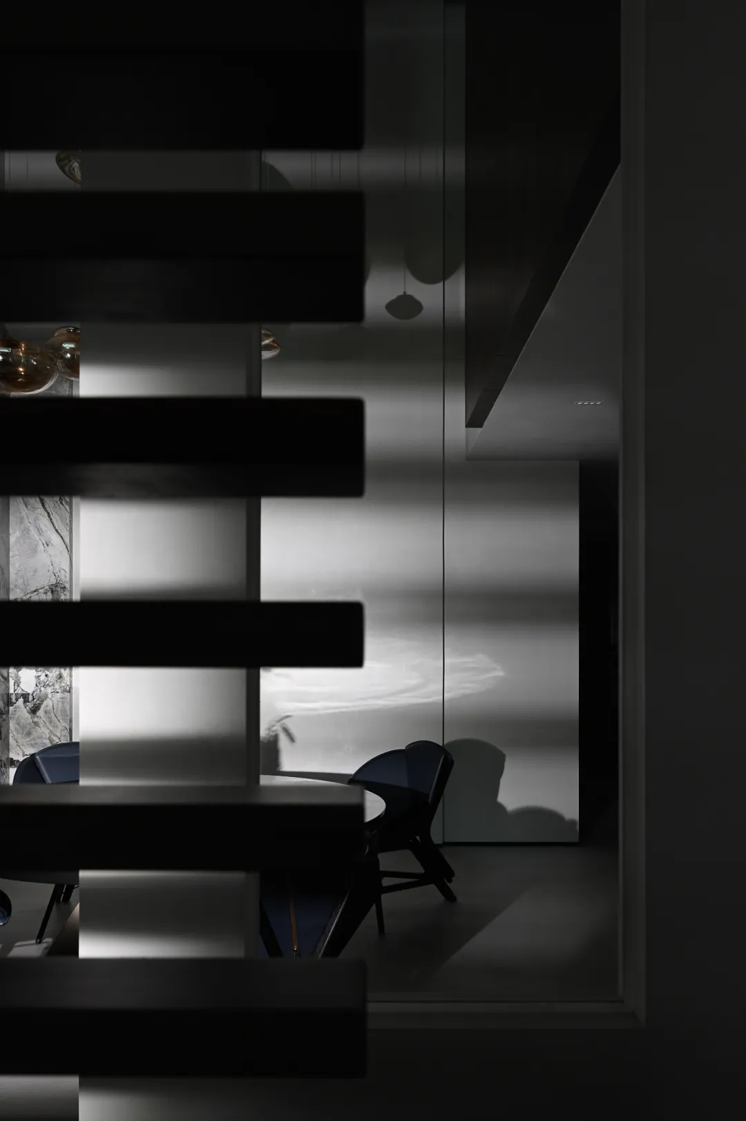 自负二层进入,即逢盛景,自然光由天井倾泻而下,如银练般贯穿五层建筑。粉黛乱子草以一己之力,在大篇幅留白的悠长中植入野趣,如几何体块中破壁而出,柔化了混凝土的冷峻,形成物性与自然的戏剧性对话。一面引入生命的蓬勃能量,一面转译为艺术的切片装置。一室三折,幽游相生。光是牵引,点化蜿蜒,南向天井贯通,让天光一泻而下,将现浇楼梯的原始朴意转译为灵动的诗行。轻盈的琴键姿态,曲折有致,奏响韵律,引渡着视线与动线一并盘旋向上,至负一层的影视厅空间。与平行时空的电梯,形成纵向通道上的洄游动线,每一面行走,皆如园中游。东方诗意造境哲学的基因,在于埋下言有尽而意无穷的微妙遐想,以留白延无限,以张力蕴空灵。设计自居者的生活习惯里提取形态,隐去冗余,将诗性和雅情藏于时空的虚无间。混凝土的原始质感,向上牵引的递进脉络,物与物的理性独白,定格为一幅可呼吸的静默油画,处处昭示着对本真精神美学的热烈崇尚。