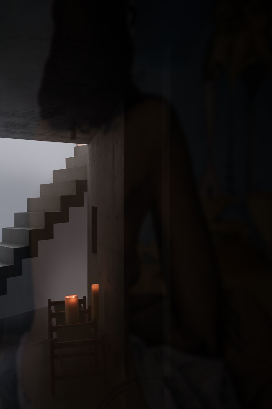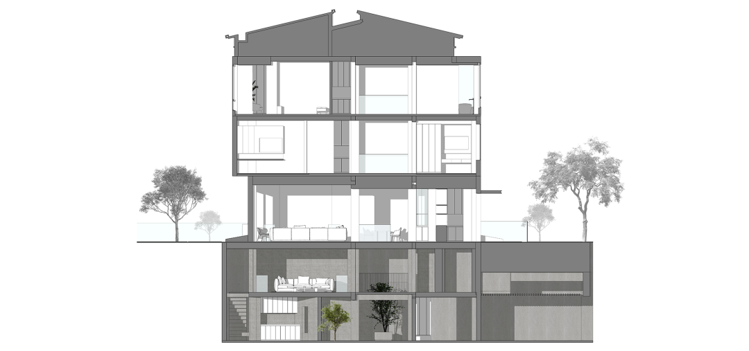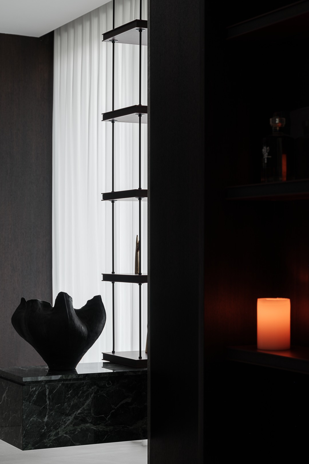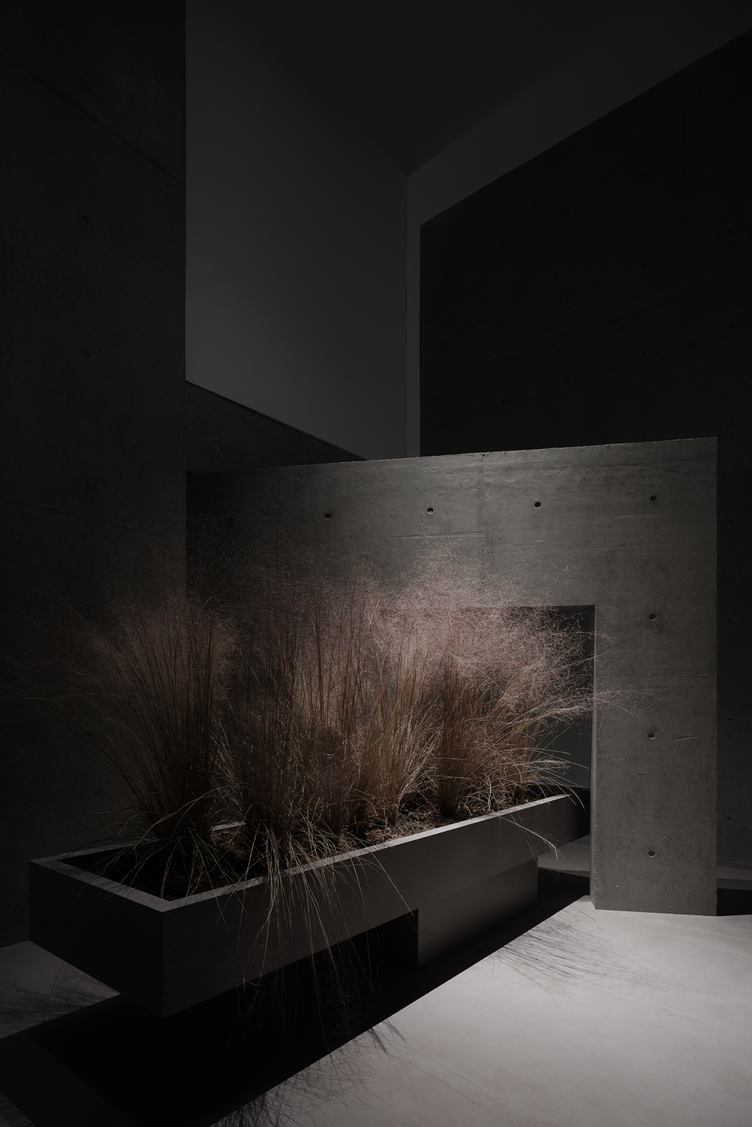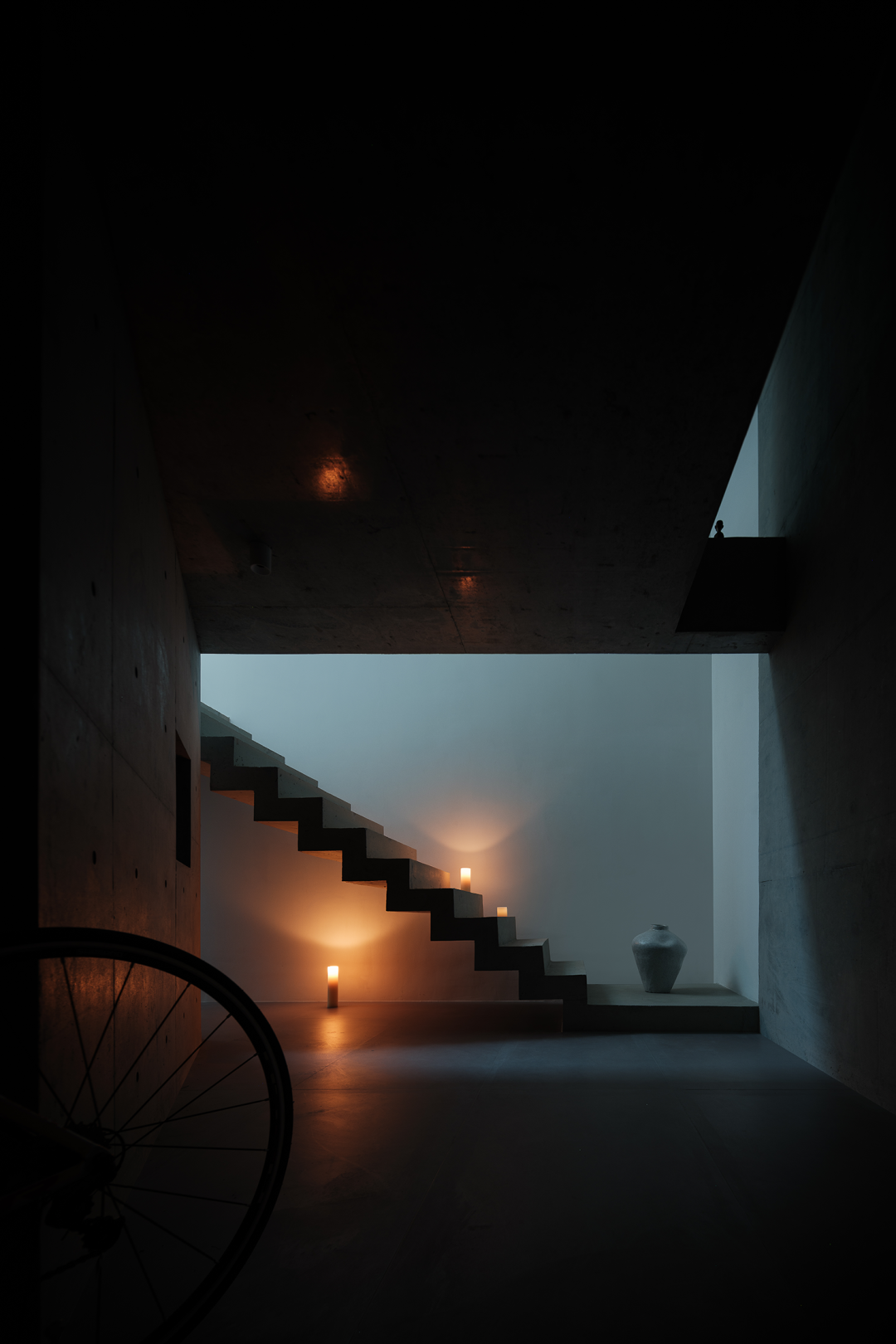 自负二层进入,即逢盛景,自然光由天井倾泻而下,如银练般贯穿五层建筑。粉黛乱子草以一己之力,在大篇幅留白的悠长中植入野趣,如几何体块中破壁而出,柔化了混凝土的冷峻,形成物性与自然的戏剧性对话。一面引入生命的蓬勃能量,一面转译为艺术的切片装置。一室三折,幽游相生。光是牵引,点化蜿蜒,南向天井贯通,让天光一泻而下,将现浇楼梯的原始朴意转译为灵动的诗行。轻盈的琴键姿态,曲折有致,奏响韵律,引渡着视线与动线一并盘旋向上,至负一层的影视厅空间。与平行时空的电梯,形成纵向通道上的洄游动线,每一面行走,皆如园中游。东方诗意造境哲学的基因,在于埋下言有尽而意无穷的微妙遐想,以留白延无限,以张力蕴空灵。设计自居者的生活习惯里提取形态,隐去冗余,将诗性和雅情藏于时空的虚无间。混凝土的原始质感,向上牵引的递进脉络,物与物的理性独白,定格为一幅可呼吸的静默油画,处处昭示着对本真精神美学的热烈崇尚。