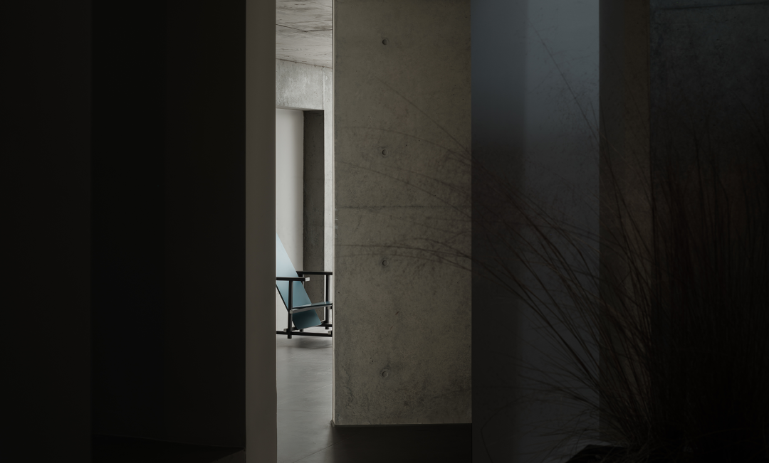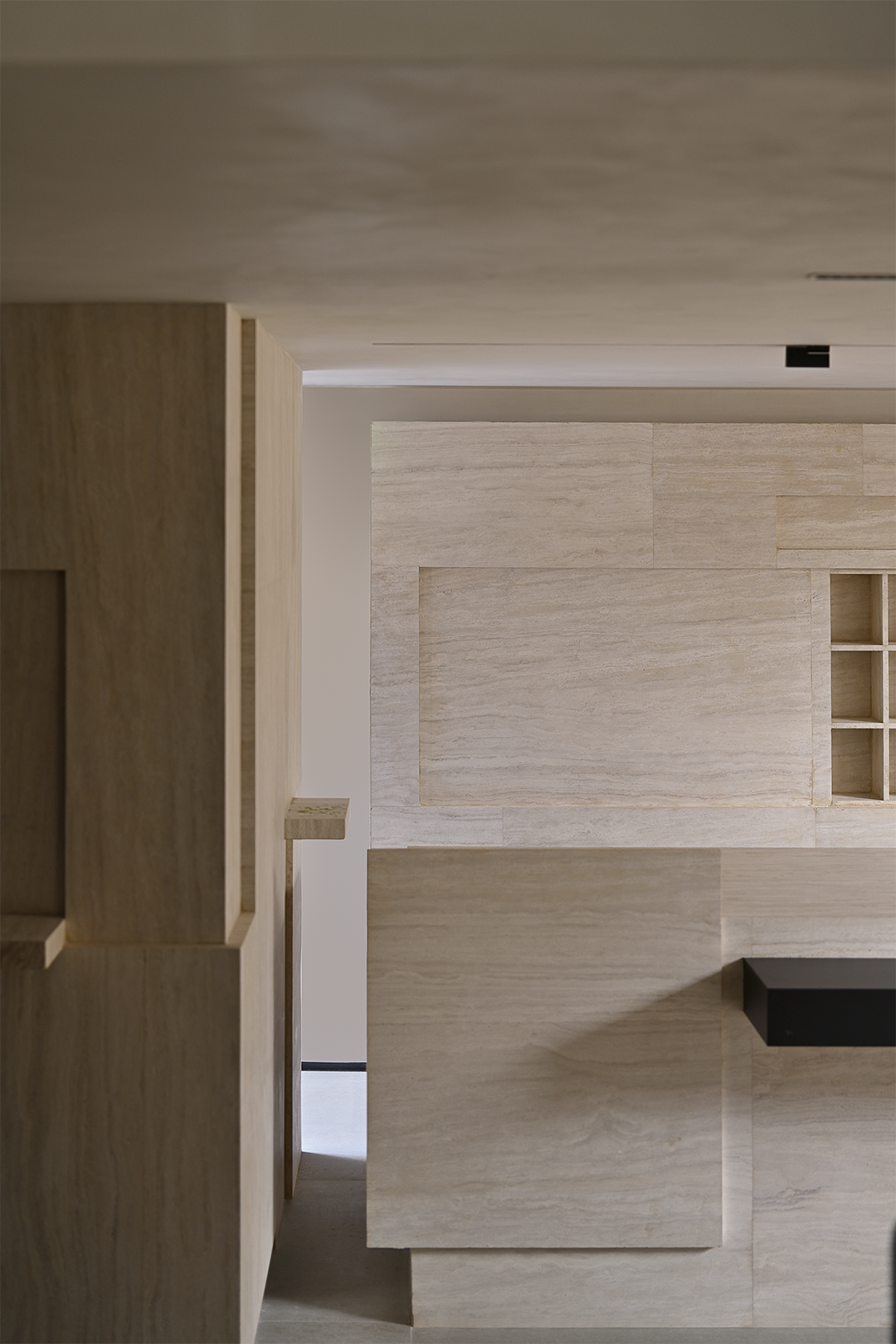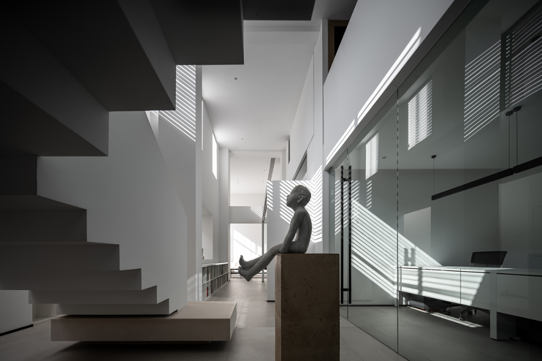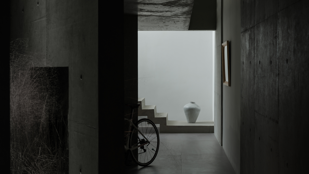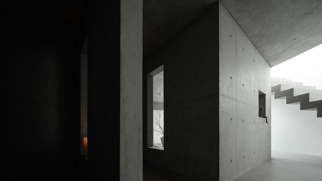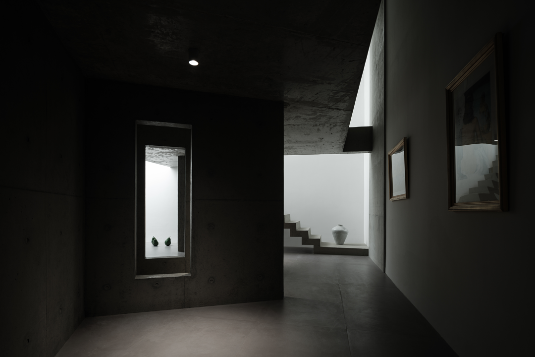 “光之井”是内与外的通道,消解地下空间的沉寂,空间的静止与生命的流动同时在场,完成由自然唤醒精神的关联。居者多年的画作收藏隐于玻璃画框中,与粗粝的混凝土立面碰撞出别样的风情,空间影与画中景虚实交叠,悠远而绵长。一如此间的精神世界,叠影扶疏,静默成诗。疏密得宜,流转无限。片墙的建筑体块或分割、或互语、或半掩,借比例与尺度的精准雕琢,直白中重构婉转,以当代手法完成了一室之内的曲径通幽意。内建筑错落体块主导的层次与韵律,让片段与连贯性叙事同时在线。热爱的佐证,定格为一幅幅框景之美;移步换一境,赋予家高度的戏剧性与妙趣性。虚室生白,写境至上。静默不是空白,是空灵的觉醒,神性的禅意。当代建筑手法以几何切割,在室内勾勒出迂回转折的空间叙事。洄游路径衍生多重动线,每一转折皆藏一景,或虚或实,步移景异。视线随动线探索,动线因视线而生动, “简明” 的秩序与 “深度” 的意境共融共生,铺陈出疏密张弛皆合韵的园林式境界。