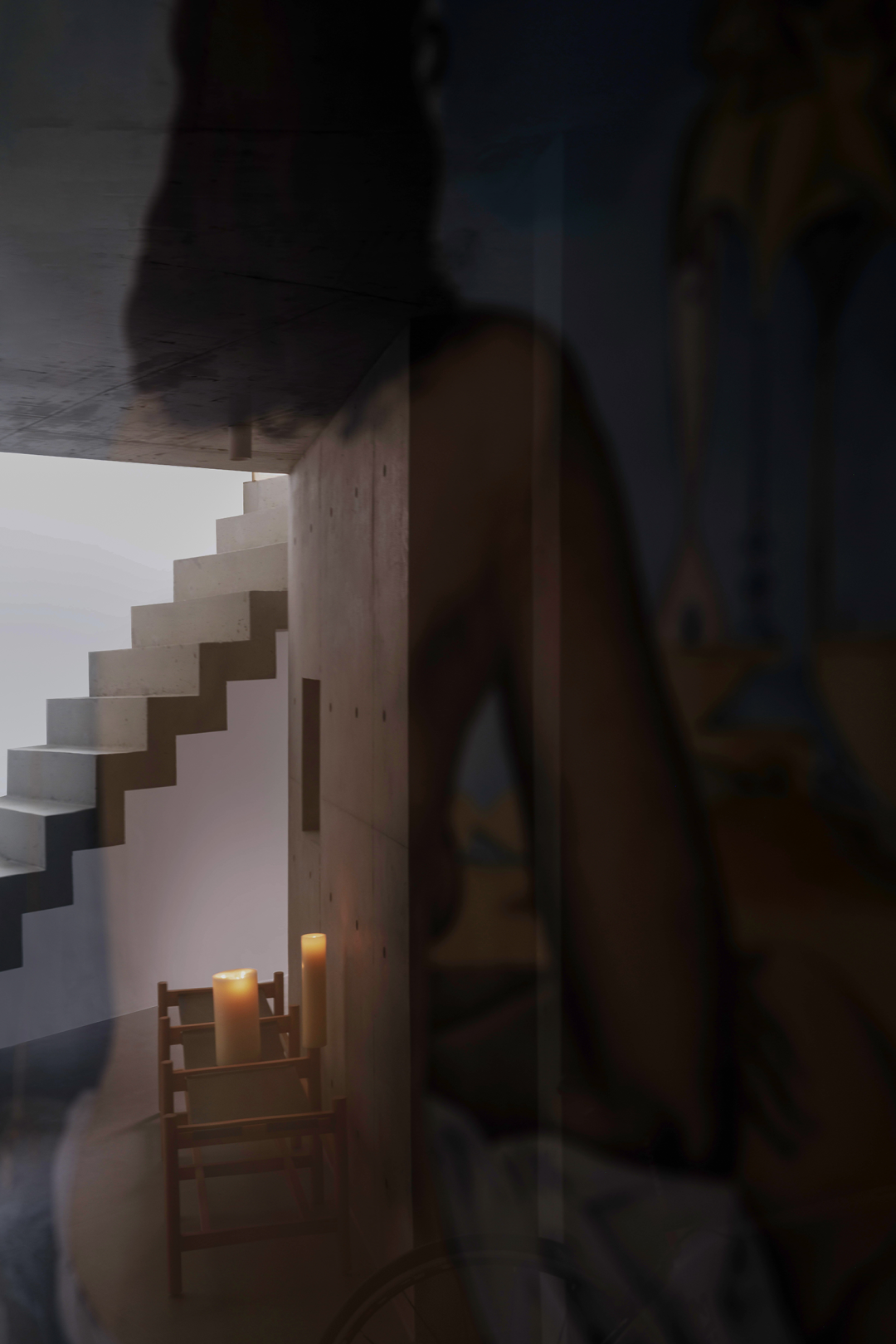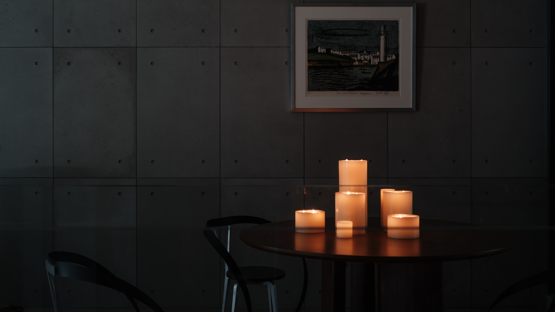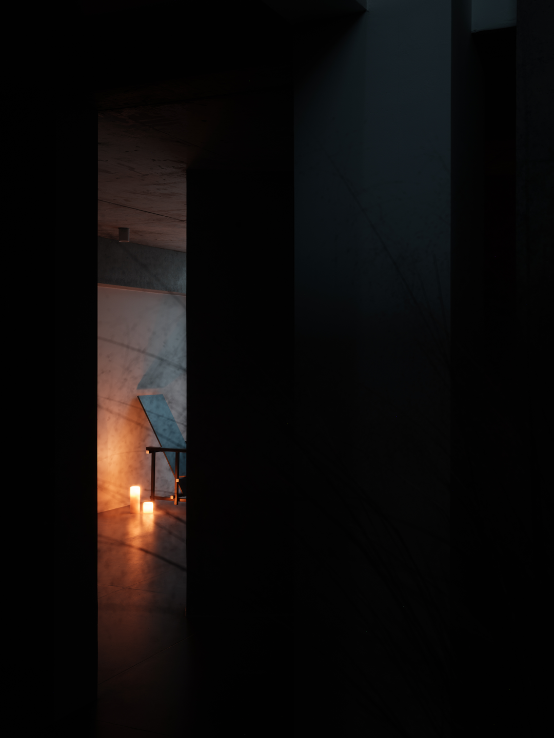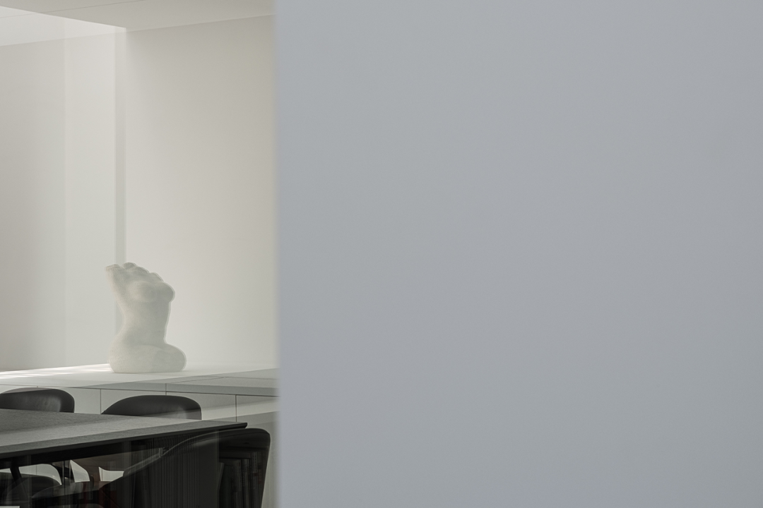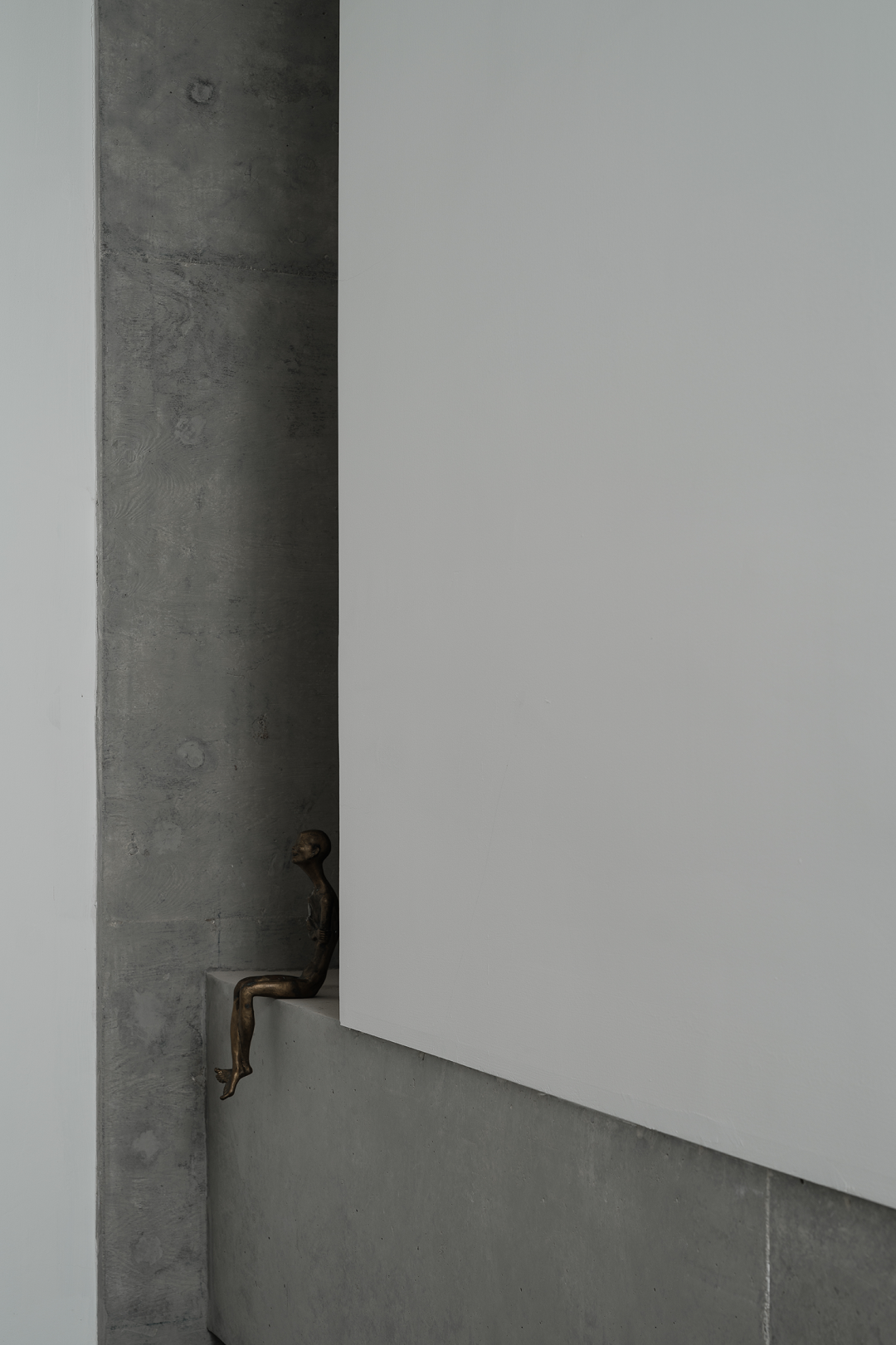 “光之井”是内与外的通道,消解地下空间的沉寂,空间的静止与生命的流动同时在场,完成由自然唤醒精神的关联。居者多年的画作收藏隐于玻璃画框中,与粗粝的混凝土立面碰撞出别样的风情,空间影与画中景虚实交叠,悠远而绵长。一如此间的精神世界,叠影扶疏,静默成诗。疏密得宜,流转无限。片墙的建筑体块或分割、或互语、或半掩,借比例与尺度的精准雕琢,直白中重构婉转,以当代手法完成了一室之内的曲径通幽意。内建筑错落体块主导的层次与韵律,让片段与连贯性叙事同时在线。热爱的佐证,定格为一幅幅框景之美;移步换一境,赋予家高度的戏剧性与妙趣性。虚室生白,写境至上。静默不是空白,是空灵的觉醒,神性的禅意。当代建筑手法以几何切割,在室内勾勒出迂回转折的空间叙事。洄游路径衍生多重动线,每一转折皆藏一景,或虚或实,步移景异。视线随动线探索,动线因视线而生动, “简明” 的秩序与 “深度” 的意境共融共生,铺陈出疏密张弛皆合韵的园林式境界。