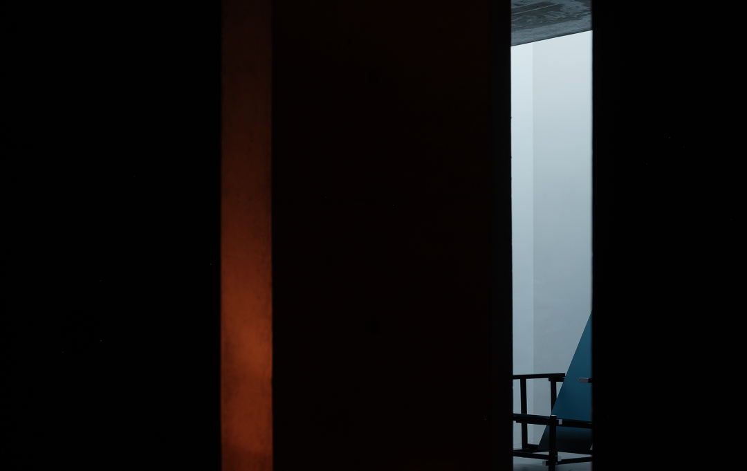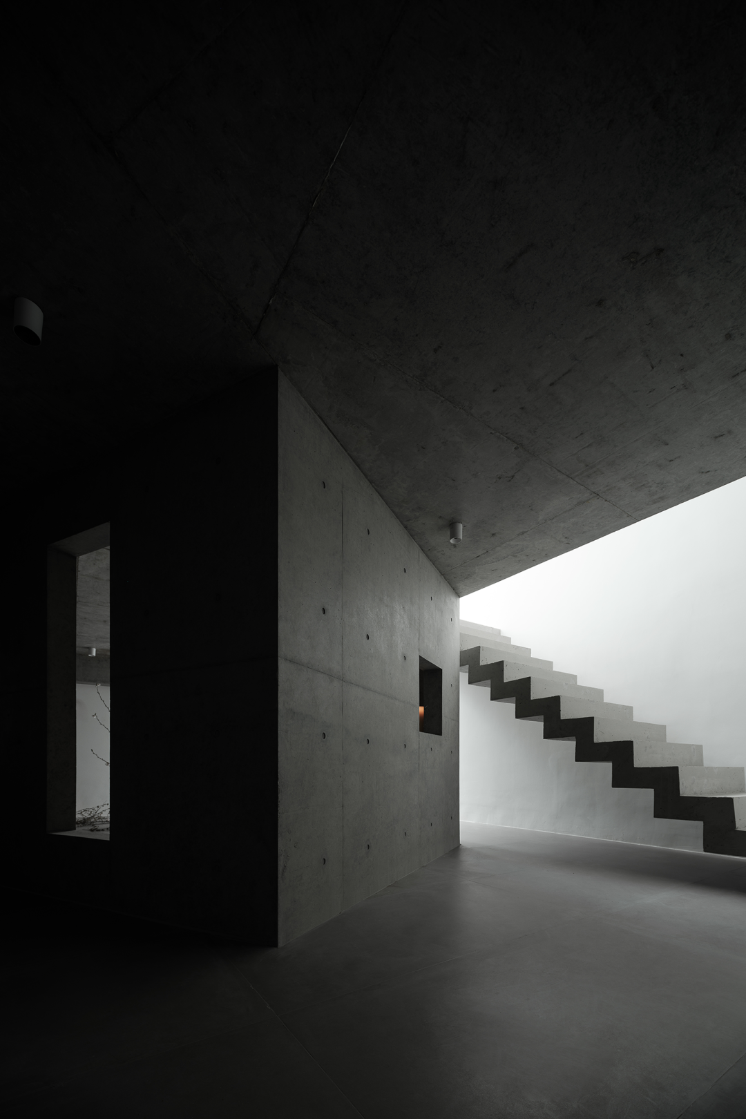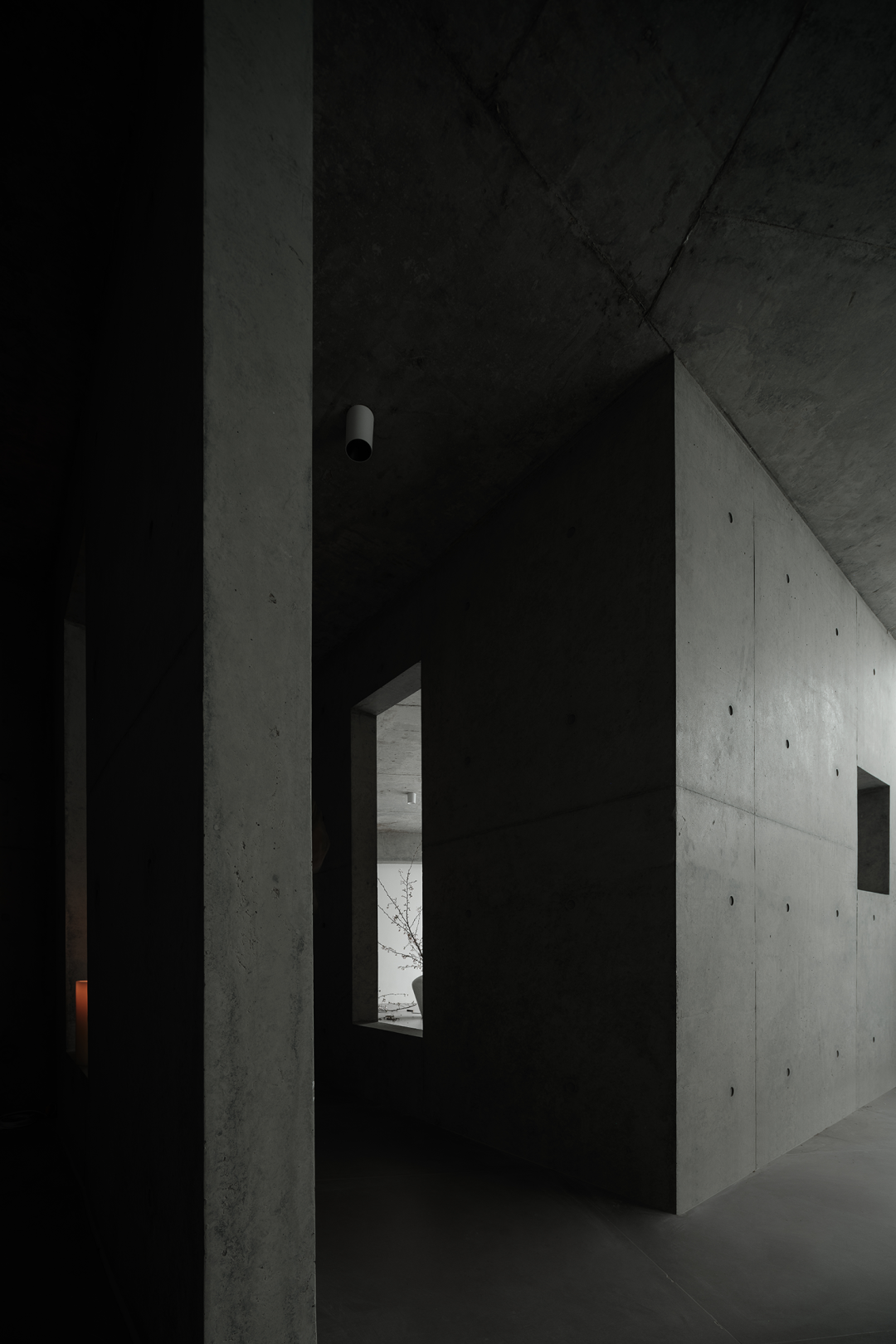 大篇幅的清水混凝土叙事之上,微部的小境雕琢最动人。错落穿插的洞窗体块,是解构原始平淡的关键落笔。只需一束光的加持,生长出视线与光线的透视效应,忽远忽近,或藏或露,新的空间关系互语,虚中有实,实中有虚……