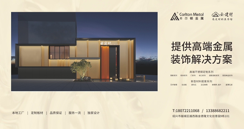 卡尔顿金属,绍兴高端金属装饰专家,专注于提供定制化金属装饰方案。主营不锈钢系列,包括隔断、柜体、门、收口等,以及新材料系列,如艺术玻璃、生态板、透光石等。以卓越品质和精湛工艺著称,配备先进设备,严格把控质量,确保产品高标准。金属美学的倡导者,我们不断创新,追求金属艺术的极致。