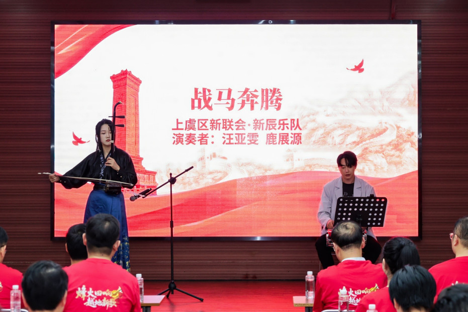 作为市委统战部推动红色文化落地的重要实践,音乐会精心设计《烽火战歌》《砥柱中流》《胜利曙光》《薪火永传》四个篇章,以诗朗诵、混声合唱、独唱、独奏等艺术形式,生动再现中华民族艰苦卓绝的抗战历程,歌颂中国共产党领导的伟大胜利,传递越地儿女弘扬爱国主义精神与奋力谱写中国式现代化绍兴篇章的坚定决心。音乐会在气势恢宏的抗战回顾视频中拉开了序幕。《微山湖》的明快藏着芦苇荡里的抗战智慧;《万里长城永不倒》的铿锵直击人心,唱出民族不屈的骨气。当西藏那曲交流干部携藏汉双语唱响《再唱山歌给党听》,辽阔与深情交织,掌声伴着歌声在夜色中漾开,成了全场最动人的共鸣。随后,《战马奔腾》的器乐声如沙场号角激昂,诗朗诵的字句载着历史厚重,直至《我的中国心》《团结就是力量》响起,全场起立挥舞手臂同唱,八十年前的抗争热血与今日的幸福光景,在合唱中紧紧相拥,将热血沸腾的家国情怀凝具成永恒的感动。