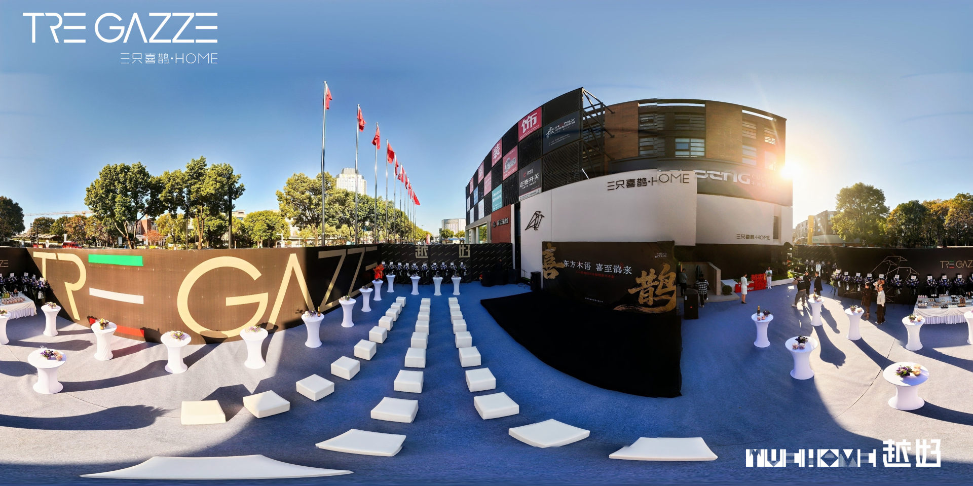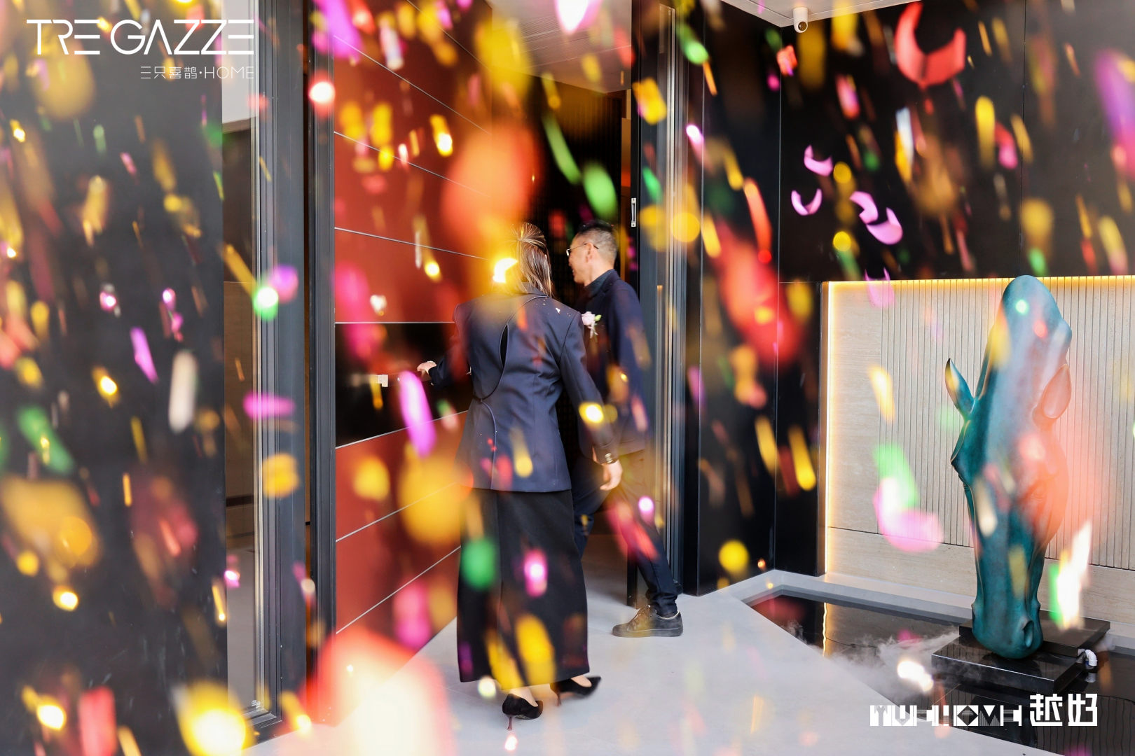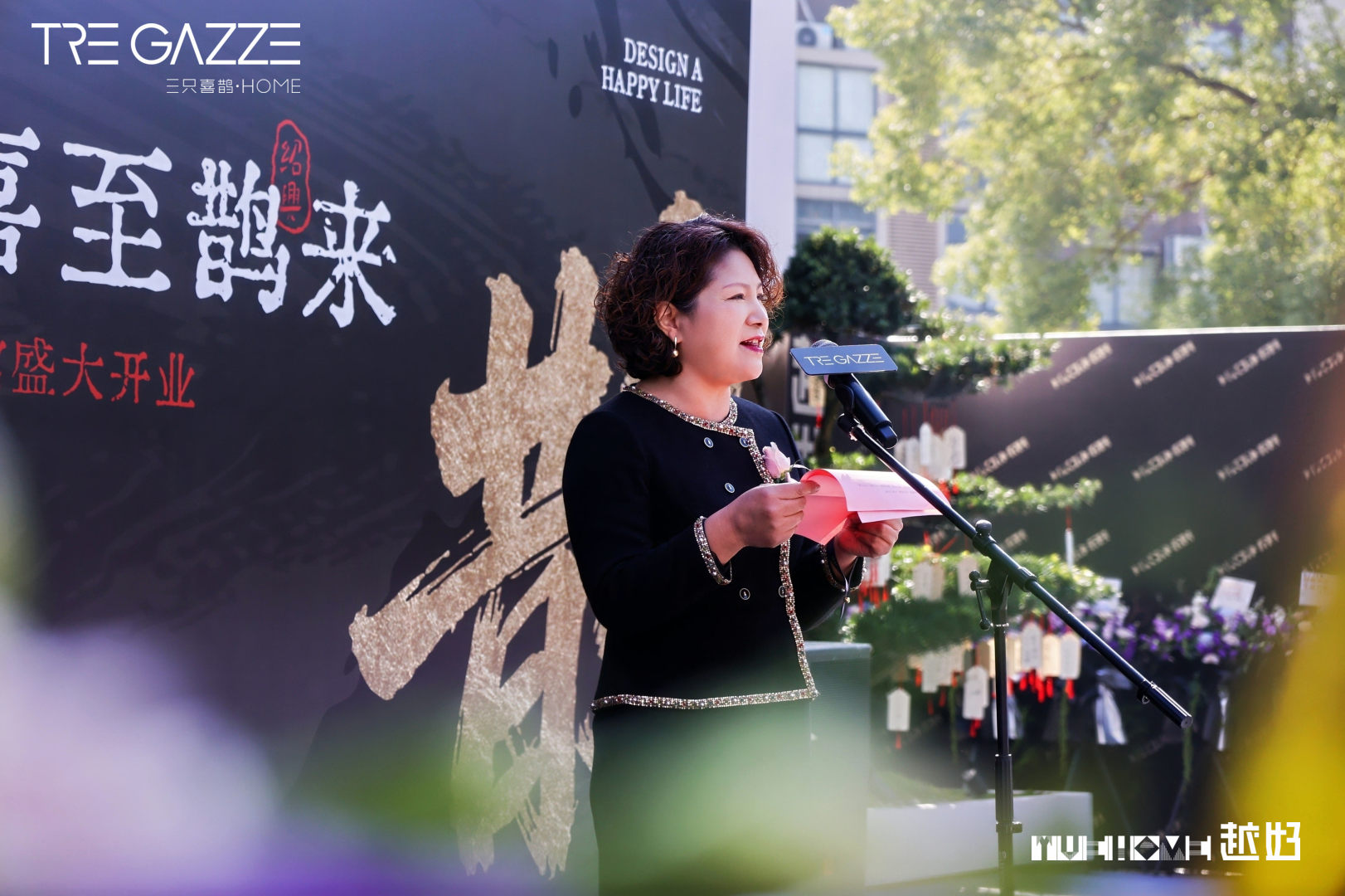 盛典高潮迭起,越好家居总经理陈方明与三只喜鹊主理人Linda携手共启朱红祥门,“紫气东来,财源滚滚”的寓意随门扉开启漾满全场。这最激动人心的时刻,将仪式感推向顶点。嘉宾们合影入店,细品木纹间的匠心,感受东方雅生活的定制表达,共鉴木作艺术与生活美学的诗意交融。