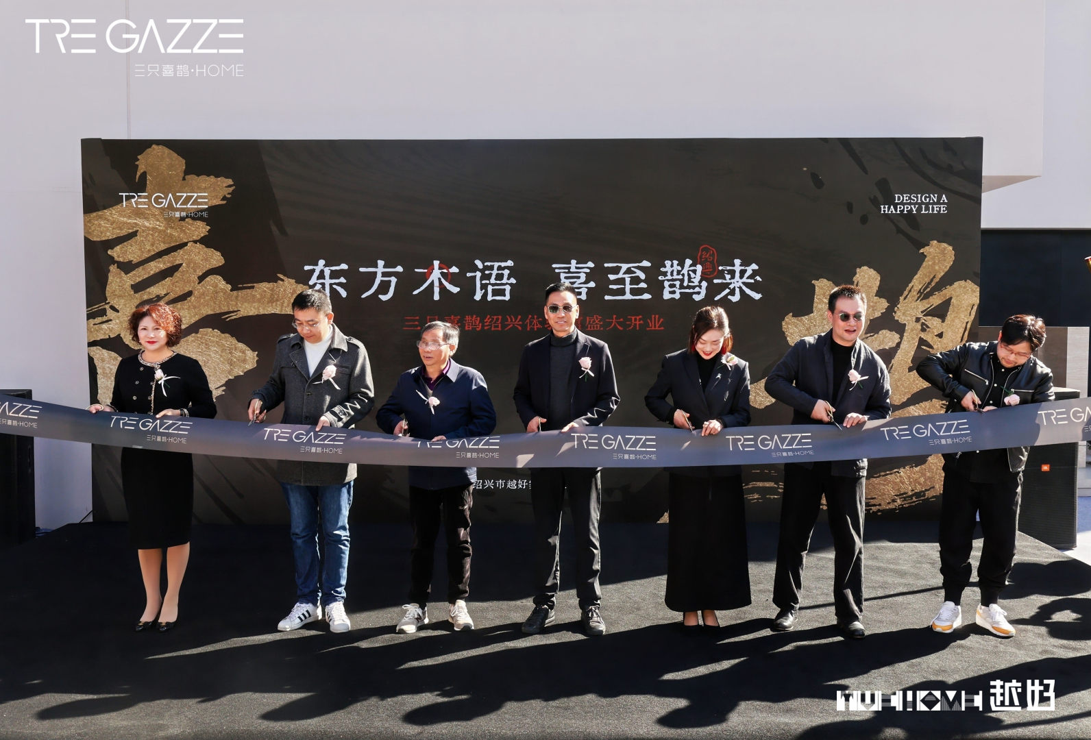 致辞毕,三只喜鹊集团副总裁洪巍、营销总经理田谏,金德隆文创园总经理谢胜林,越好家居总经理陈方明,绍兴三只喜鹊主理人Linda,家居博主凯文哥,老客户代表奚美蕉等剪彩嘉宾执金剪裁开祥瑞序章。