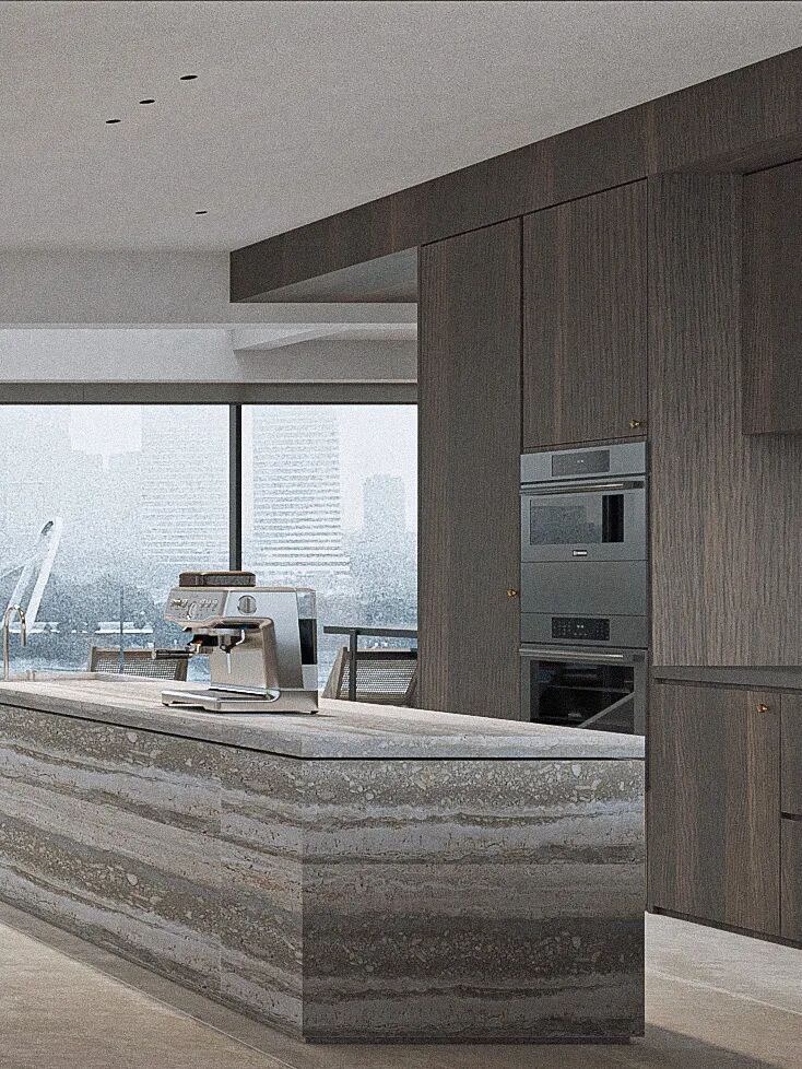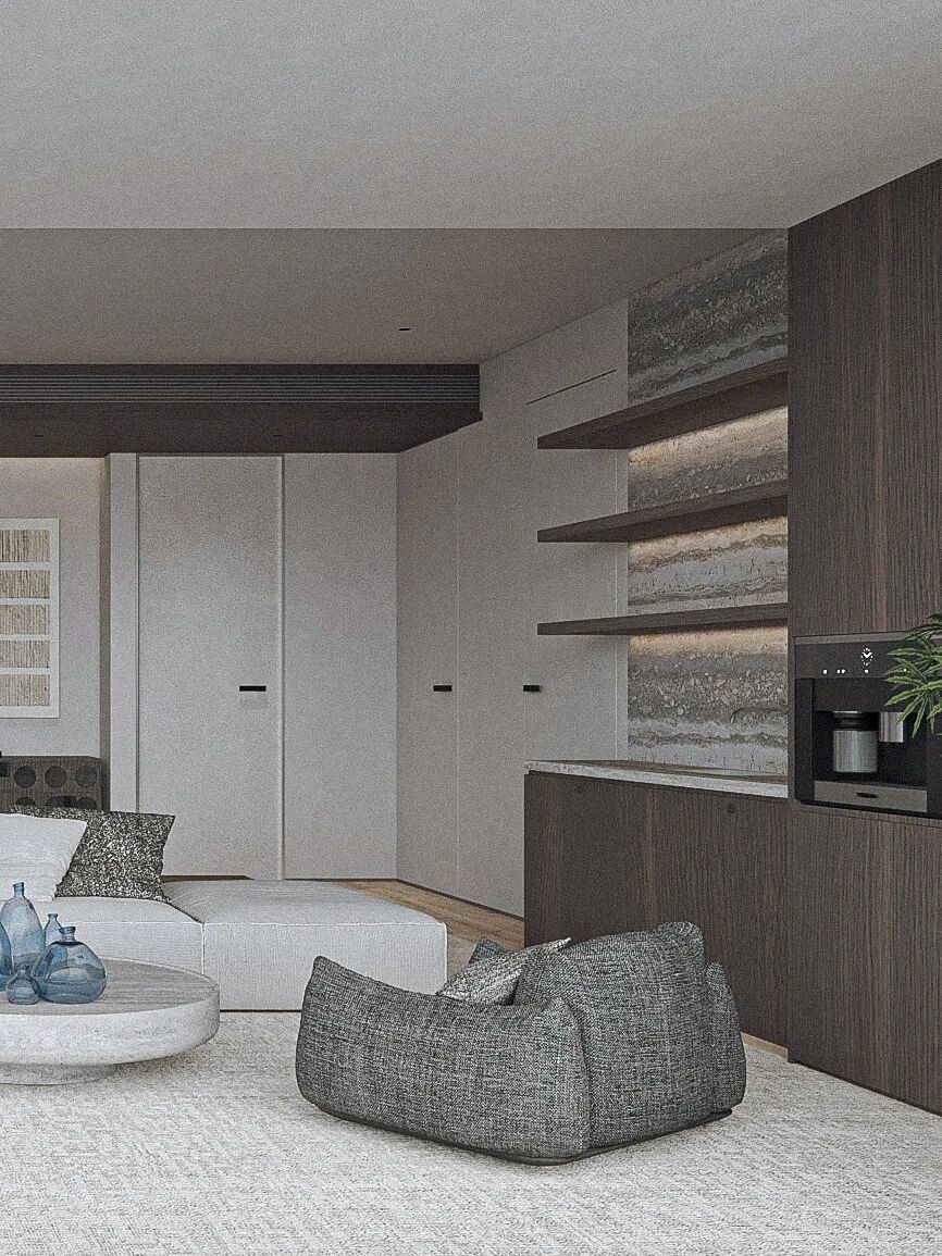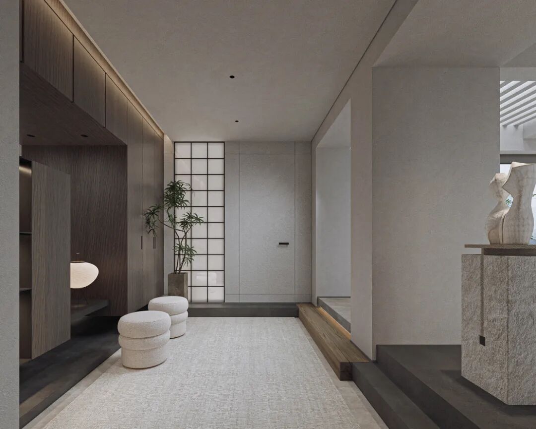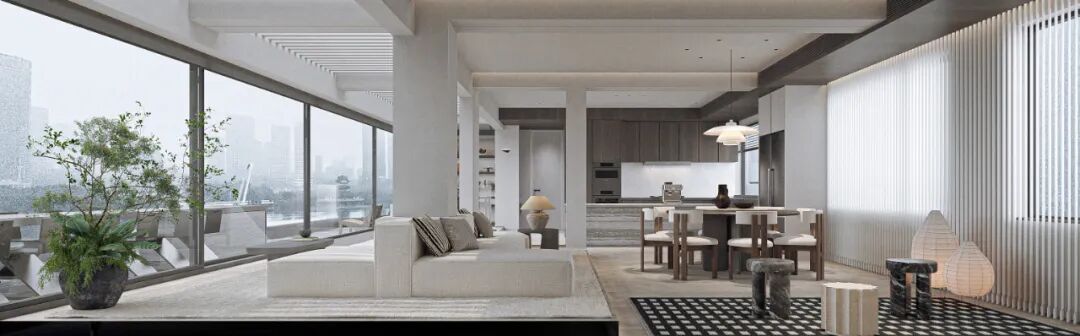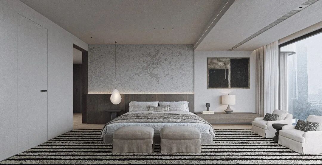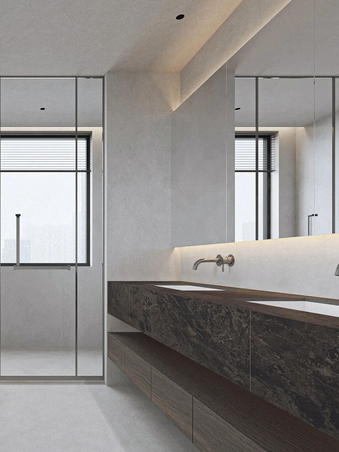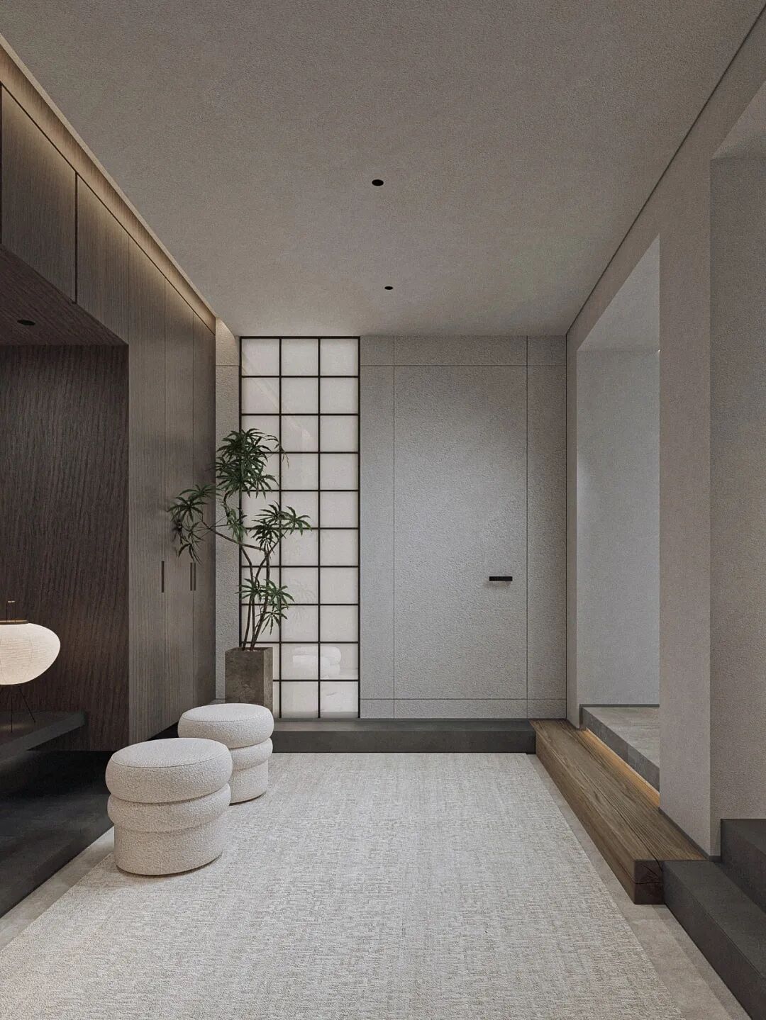 该住宅位于绍兴迪荡湖畔,是绍兴最美的湖景房,该社区拥有豪华的排屋、顶楼跃层和大平层。设计师以抱朴守拙的设计理念,力求打造一个低调、克制、和谐、静谧的空间。