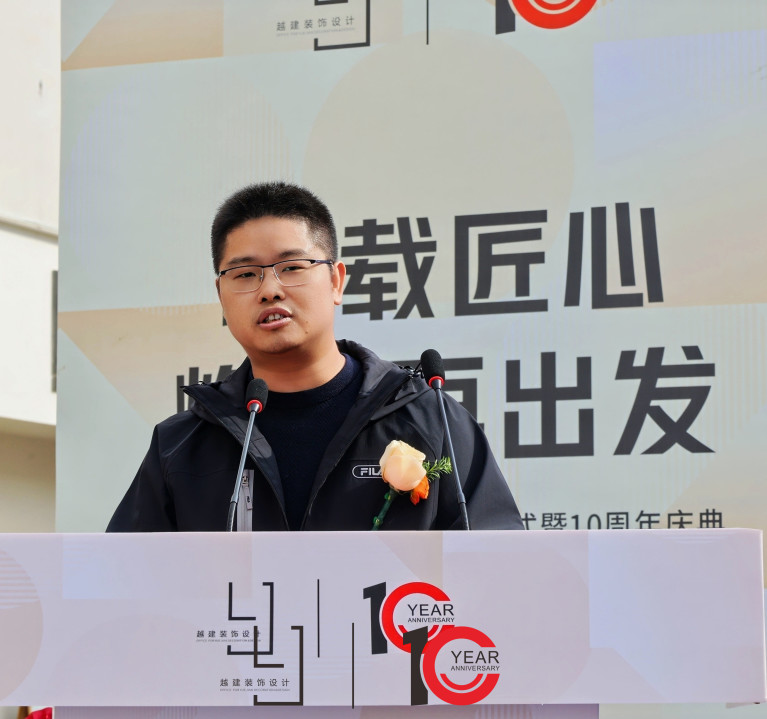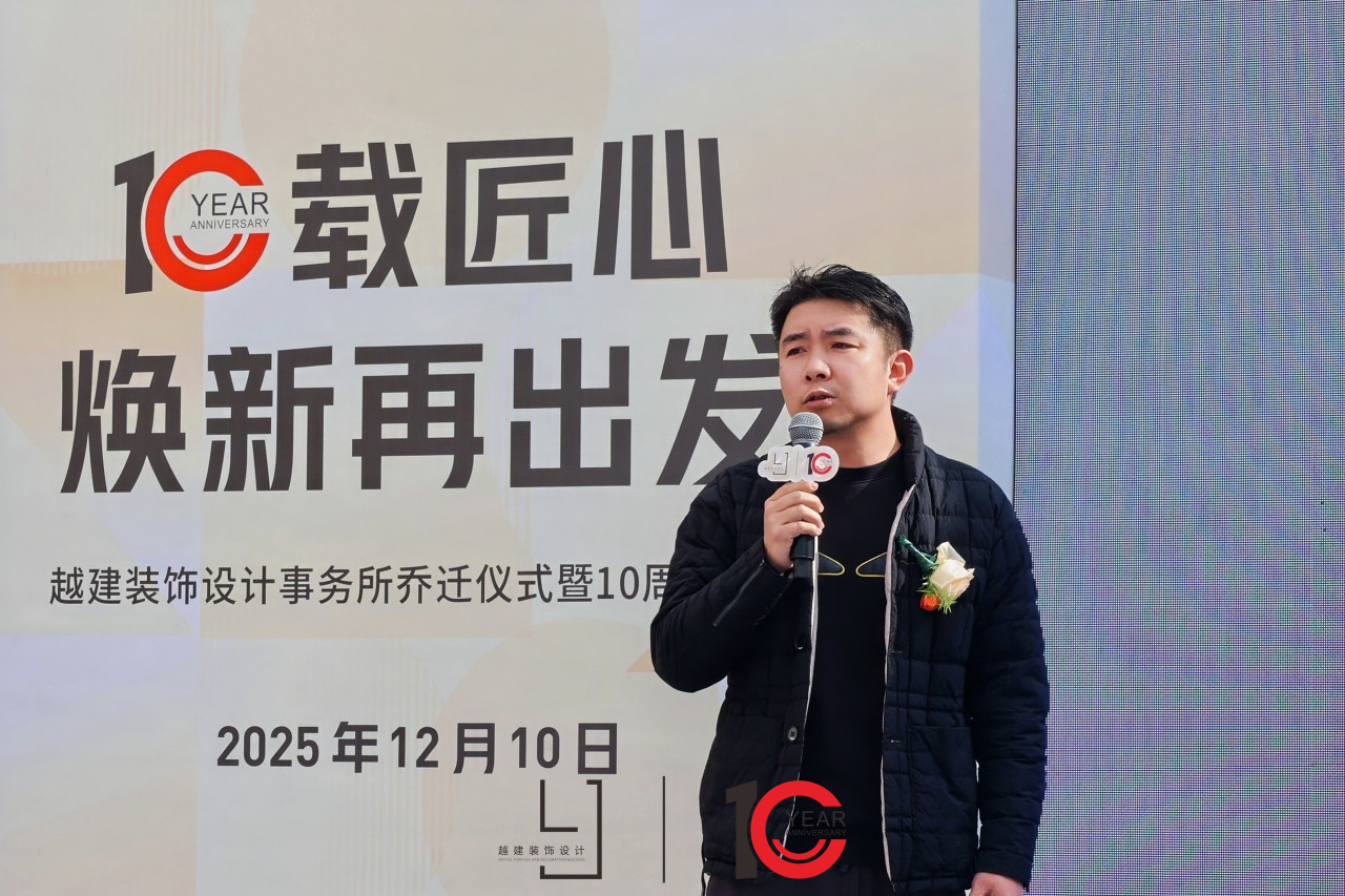 越建装饰设计事务所总经理张佳伟在致辞中回顾了企业十年来的发展历程,并向所有客户、合作伙伴及团队成员表达了诚挚感谢。他强调,乔迁新址不仅是空间的升级,更是服务理念与综合能力的全面进化。未来,越建装饰将继续以设计为核心,以匠心为底色,构建更系统、更具前瞻性的全案服务体系。