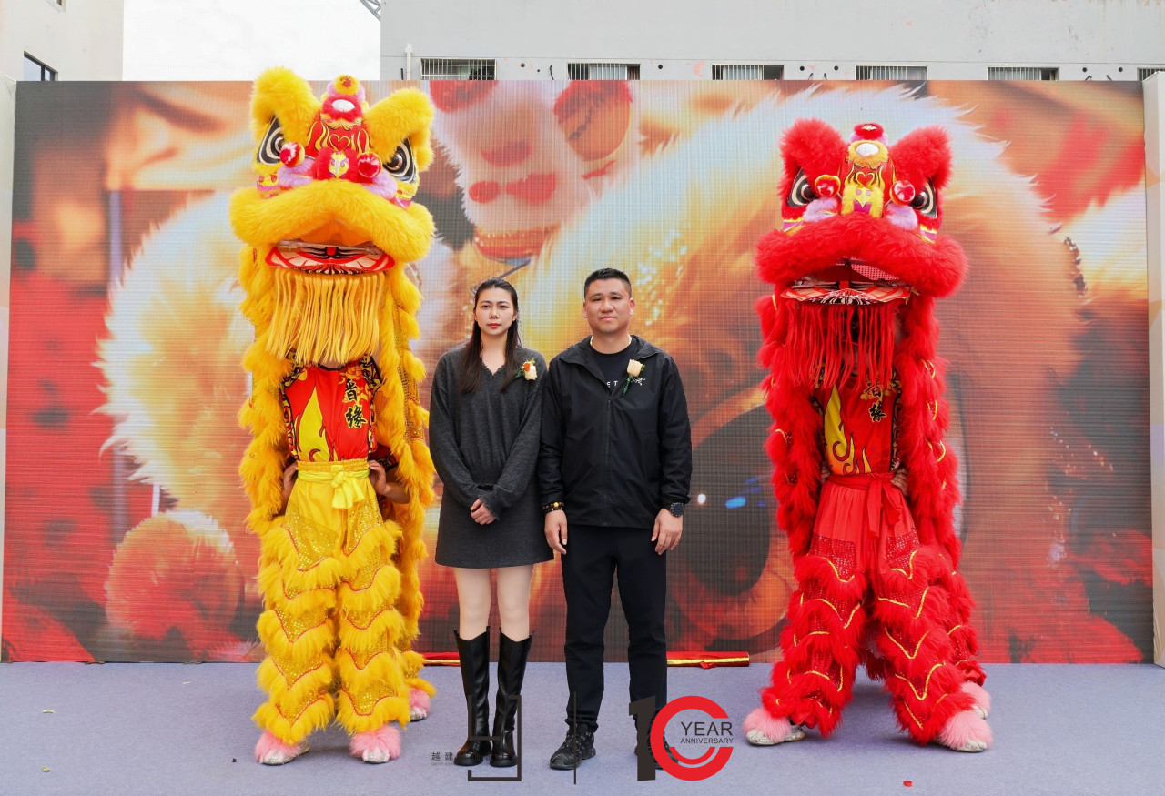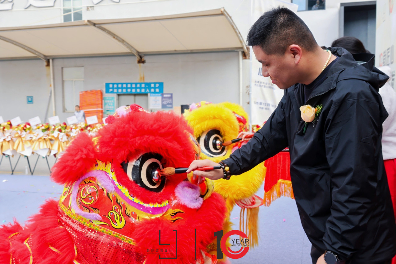随后的舞狮点睛环节,由越建装饰设计事务所总经理张佳伟及其夫人姚佳珠女士共同执笔点睛,寓意为企业注入灵性与活力,象征越建装饰在未来的发展道路上焕发新生、跃步前行。