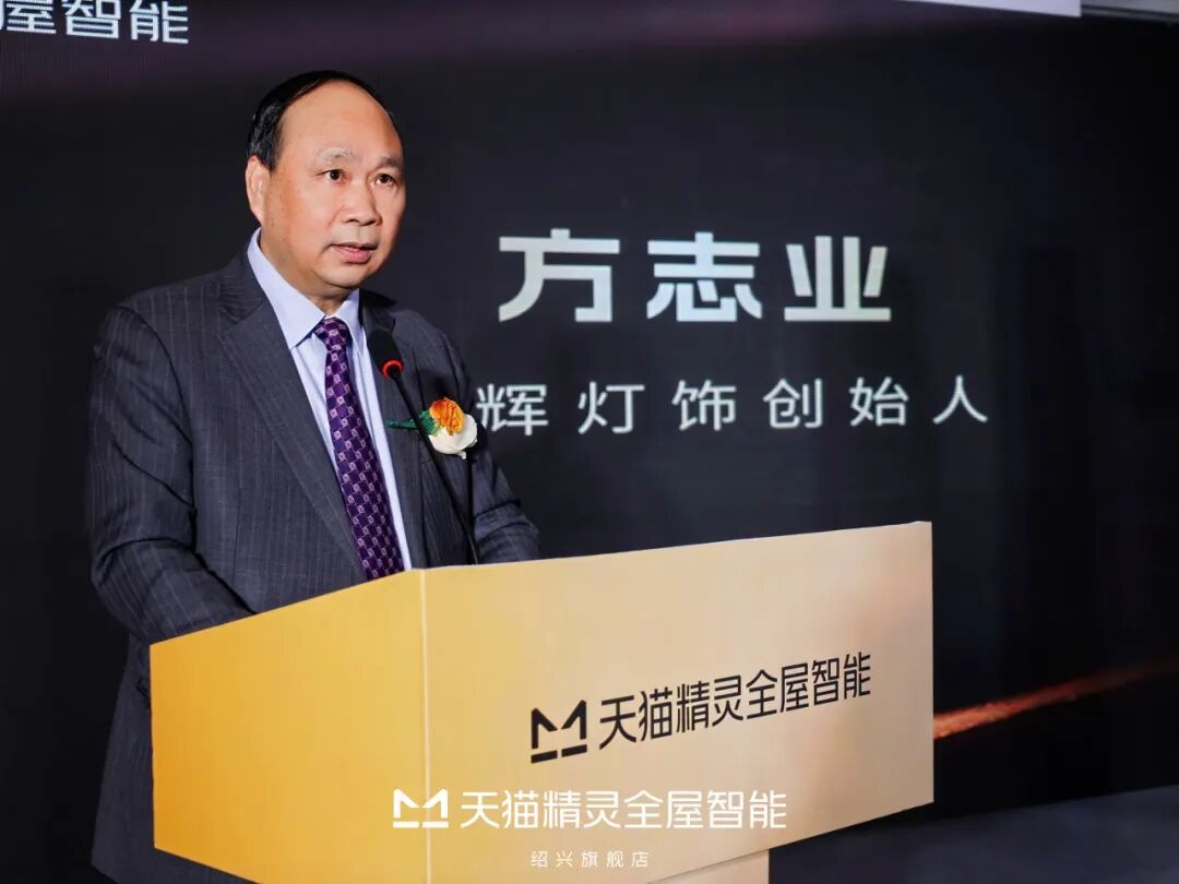 明辉灯饰创始人方志业致辞,向到场来宾表示热烈欢迎,并对智慧家居与光影艺术的融合表达了期待。