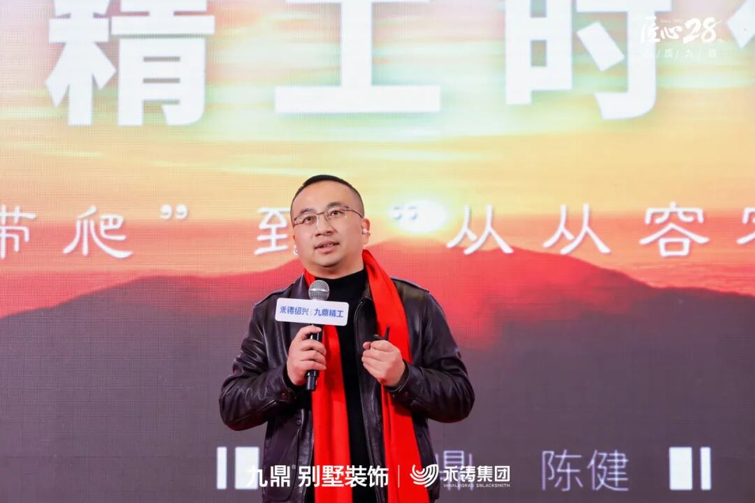 作为发布会的核心环节,绍兴九鼎执行总经理陈健带来了《精工时代,行业的未来》主题推介。他全面展示了九鼎别墅精工体系的具体内容,涵盖材料标准、工艺节点、过程管控及验收体系,并阐释了这一体系如何从根本上保障交付品质,定义行业未来服务标准。