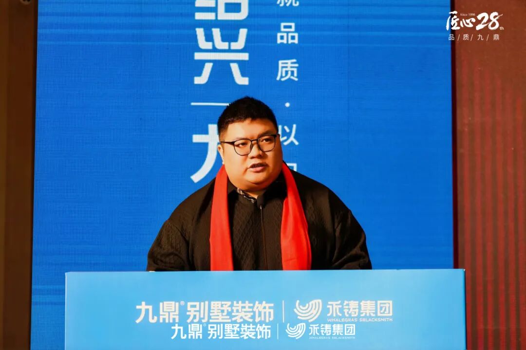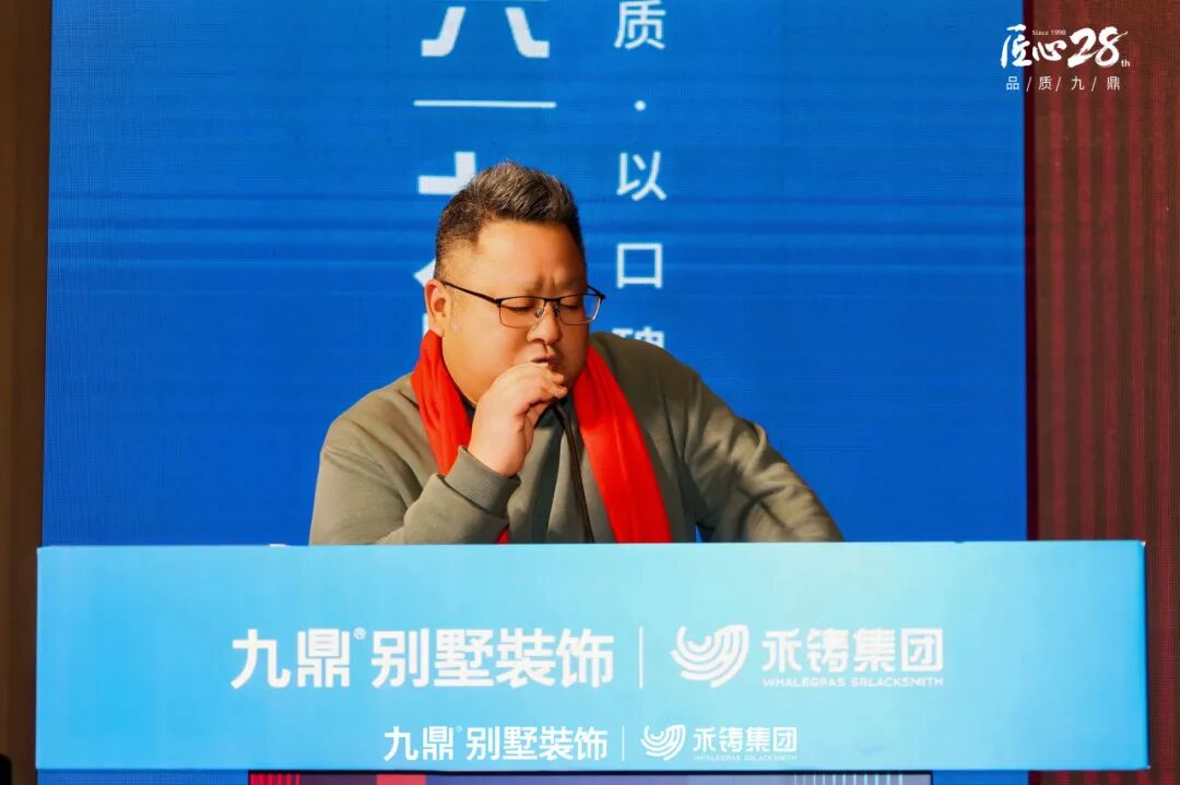 九鼎装饰集团总裁周帅在讲话中指出,精工是九鼎应对市场变革与消费升级的核心策略,是一套从客户长期价值出发、融合材料、工艺与数字管理的系统性住宅解决方案,旨在以科学的确定性守护居住的确定性。