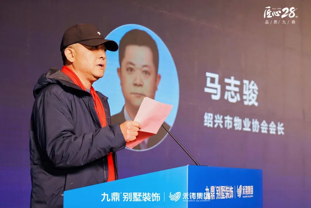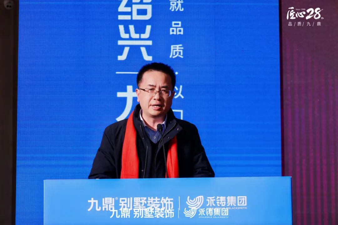 绍兴九鼎装饰总经理钟河北致欢迎辞。他深情回顾了九鼎在绍兴的深耕历程,对各界长期以来的支持表示感谢,并阐述了举办此次盛会,旨在以更高标准回馈客户,以荣誉激励团队,共同开启精工品质的新篇章。