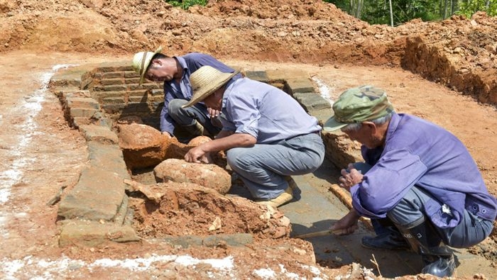 昨天上午,嵊州市石璜镇的国道527二期工程沿线苔苔山上,正在保护性发掘一座1800多年前的东汉墓葬,出土的随葬物品有鼎、盒、瓿、壶、罐等器物。据了解,去年10月28日,浙江省文物考古研究所和嵊州市文物