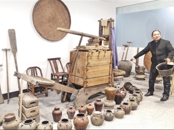 陈列馆一角将军瓦擎摇火把 “擎摇火把、将军瓦、团窝……”绍兴市收藏家协会会员诸国良,30年来收藏了1万多件日常生活老物件,主要包括农耕用具、百作师傅工具、酒作坊器具、纺织器具、民宿民居、风情特色物品