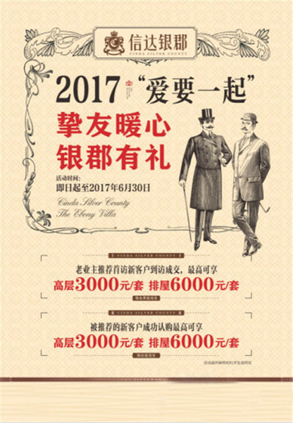 信达银郡2017“爱要一起”幸福启程,即日起至2017年6月30日,老友带新邻、同享“荐”面礼:老业主推荐初访新客户到访成交,如成交房源是高层的,则老业主每套可享3000元物业费抵用券,同时新客户可享3000元购房抵用券;如成交房源是排屋的,则老业主每套可享6000元物业费抵用券,同时新客户可享6000元购房抵用券。老友新邻既实现了生活的梦想,又享受双份购房福利。