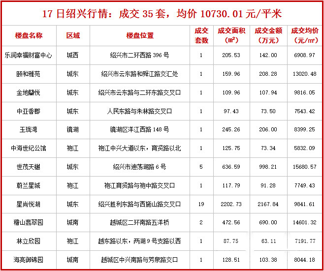 17日绍兴行情:成交35套,均价10730.01元/平米