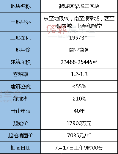 经绍兴市人民政府批准,绍兴市自然资源和规划局决定于2019年7月17日上午9时00分,以网上拍卖方式公开出让越城区柴场弄区块国有建设用地使用权,起拍楼面价7035元/㎡。