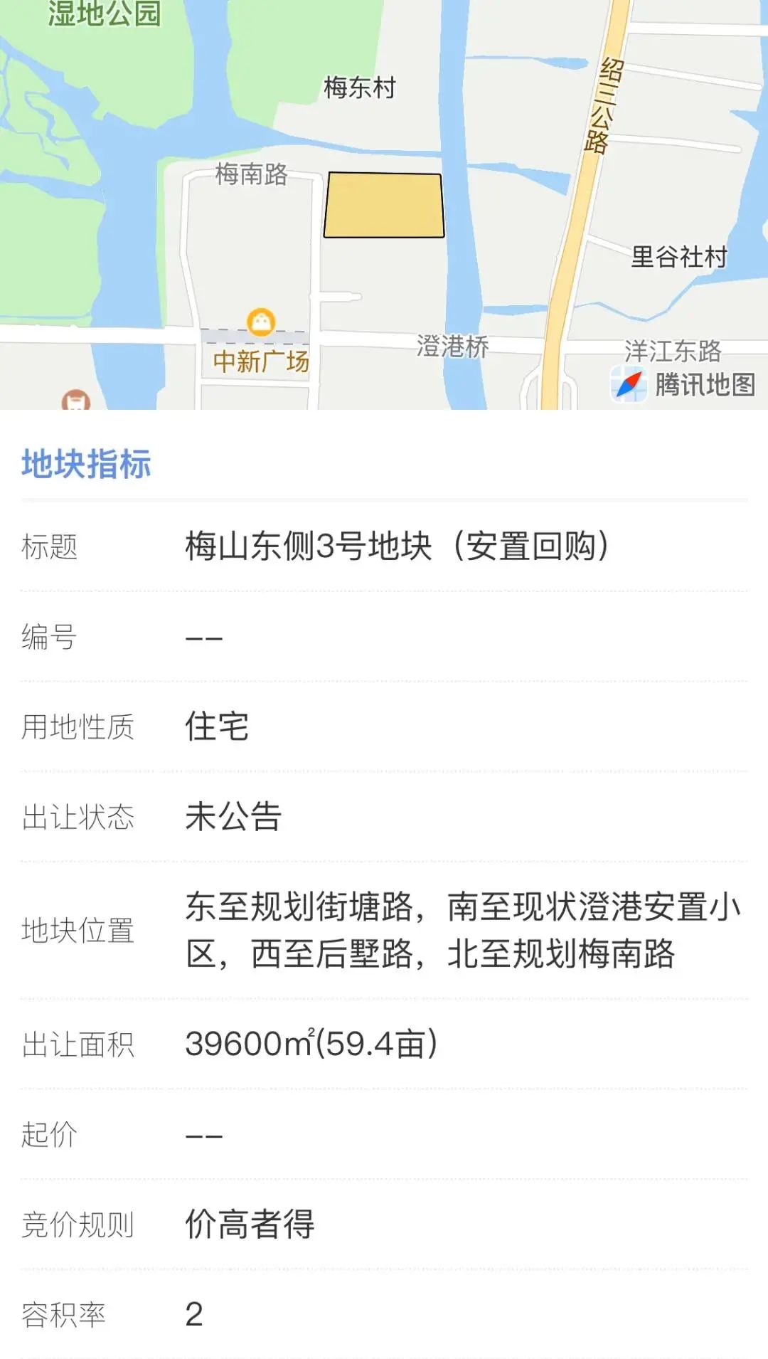 梅东村东侧3号地块则为安置房地块,出让面积39600m²。