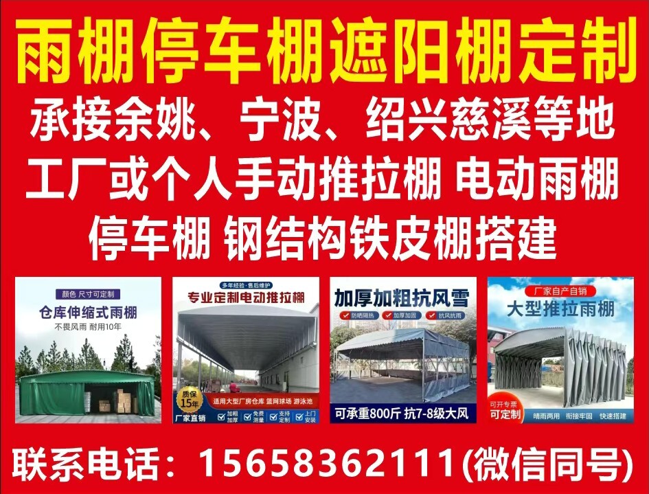 承接余姚、宁波、绍兴慈溪等地。工厂或个人手动推拉棚,电动雨棚,停车棚,钢结构铁皮棚搭建。联系电话:15658362111(微信同号)