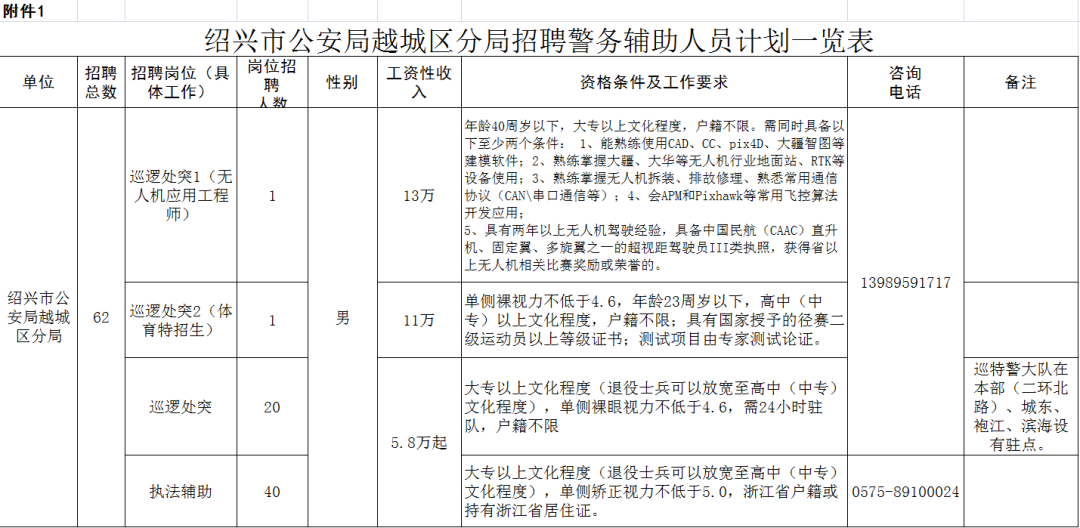 详见《绍兴市公安局越城区分局招聘警务辅助人员计划一览表》(附件1)。
