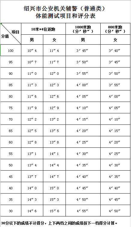 参加项目的平均分为体能成绩。单个项目得分低于30分的不计分,上下两档之间的成绩按下一档得分计算。